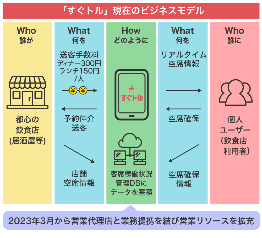 「すぐトル」は、飲食店が導入しやすいよう初期導入費用及び基本料金を無料にしており、基本的なマネタイズ方法はマッチングが成立した際に加盟店から手数料(ディナー300円/人:ランチ150円/人)をいただく、成果報酬型のビジネスモデルとなっています。