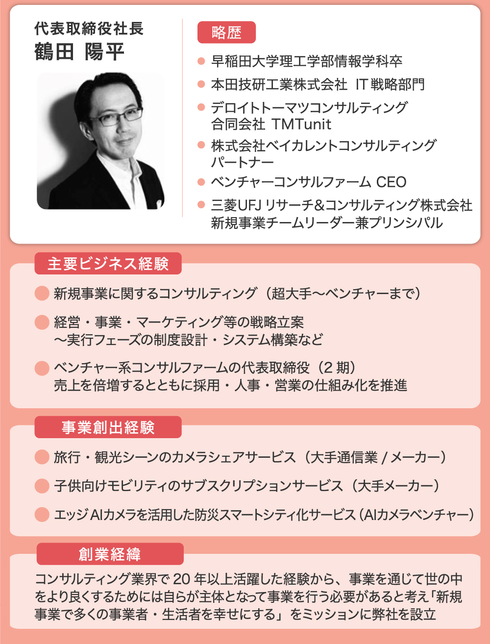 「すぐトル」のサービスをはじめた背景には、弊社代表鶴田の経験が大きく関係しています。鶴田は、大手コンサルティング企業にて新規事業戦略案件のプロジェクト責任者やチーム担当パートナーなどを歴任し、20年以上にわたり経営戦略コンサルティングの第一線で活躍してきました。
