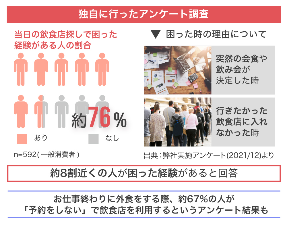 実際に弊社が実施した消費者アンケート調査では、「仕事終わりに食事に誘われて飲食店を探すのに苦労した」、「1次会は予約したが、2次会は当日探すことになり困った」など、回答者のうち8割近くの人が、当日の飲食店探しに苦労した経験があると答えています。