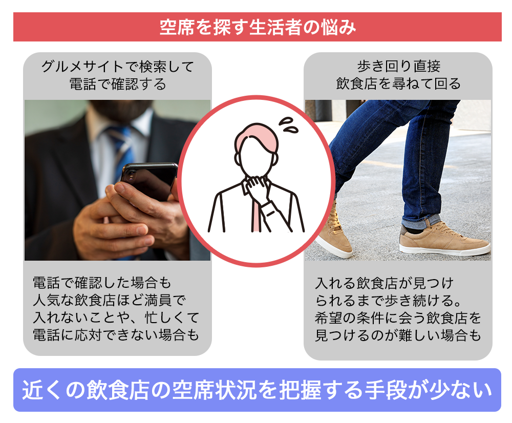 しかし、電話で問い合わせる手間と時間は、利用者・飲食店の双方にとって負担になります。特に飲食店が忙しい時間帯に何件も電話をするのは大変です。だからと言って歩いて探しまわるのも効率的ではありません。
