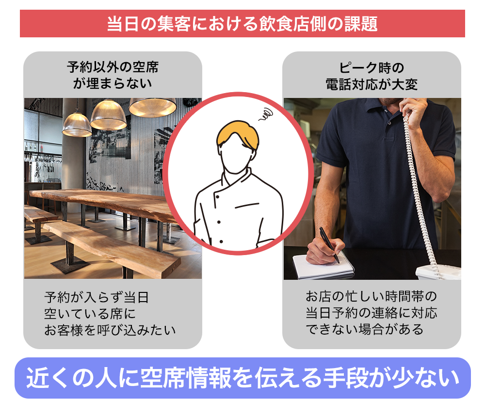 現状では、当日に飲食店を予約したい場合、店舗に直接電話で問い合わせるケースがほとんどです。しかし、飲食店側は、忙しい時間帯に何度も電話に応対するのは大変だと伺いました。