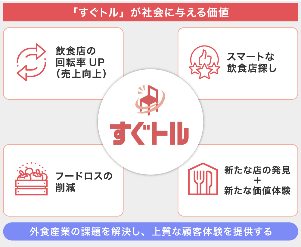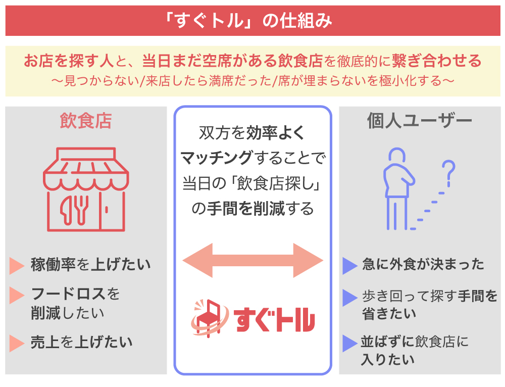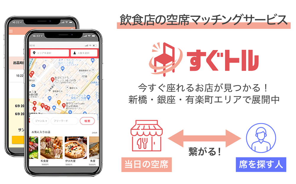 弊社は現在、東京都心部を中心に当日に特化した飲食店予約サービス「すぐトル」を運営しています。