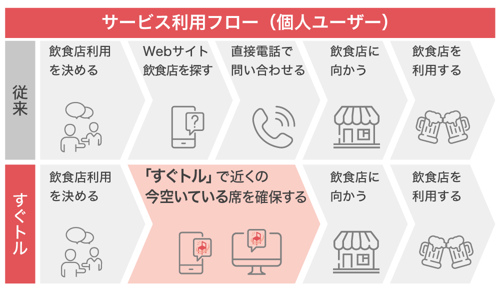 加盟店側が空席を出品するまで数秒程しかかかりませんし、個人ユーザー側も、「すぐトル」を開いて条件に合う飲食店が見つかれば最短10秒で予約が完了します。そうなれば、電話で空席を確認する必要もありません。