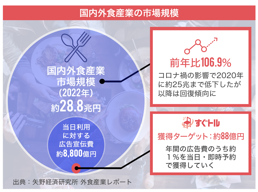 2020年以降、国内の外食産業市場規模は少しずつ復活傾向にあり、2022年は約28.8兆円まで増加しました(出典:矢野経済研究所)。その中に「当日になってからの飲食店利用に対して使われる広告宣伝費」が年間約8,800億円あると推定されており、これを「すぐトル」の対象市場規模と捉えています。弊社は、その中の「当日の即時予約」に特化することで、同市場の約1%程度を顕在化・獲得していくことを計画しています。