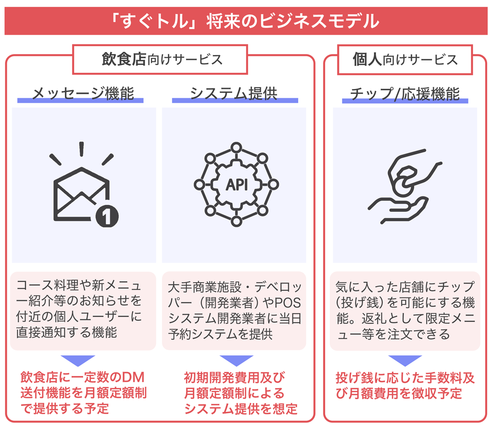 今後、必要に応じて「すぐトル」のAPIやSaaSをそれぞれの業界企業に提供し、当日における「ユーザーの食事などの店舗活用データ」を活用して店舗の運営や出店戦略を支援するなど、さまざまな分野でデータビジネスも実施していく計画です。