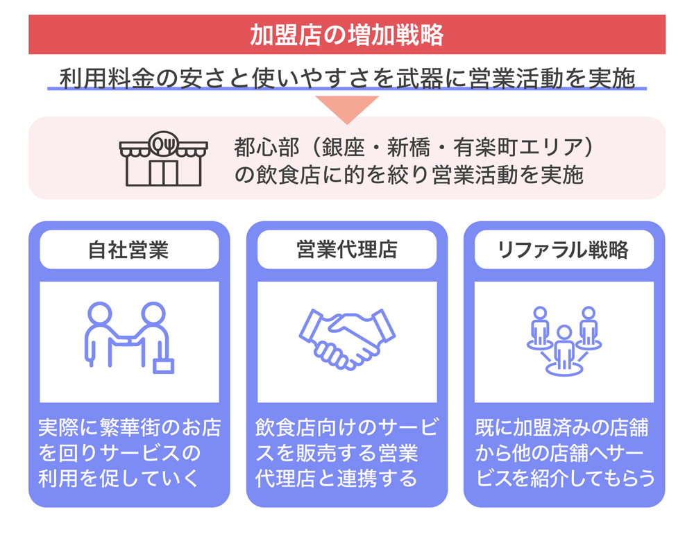 そのためにも、まずは加盟店を増加させることが必要だと考えています。サービスの導入ハードルの低さを武器に、新橋・銀座エリアで営業してシェアを獲得し、そこから他のエリアへとサービスを広めていく計画です。