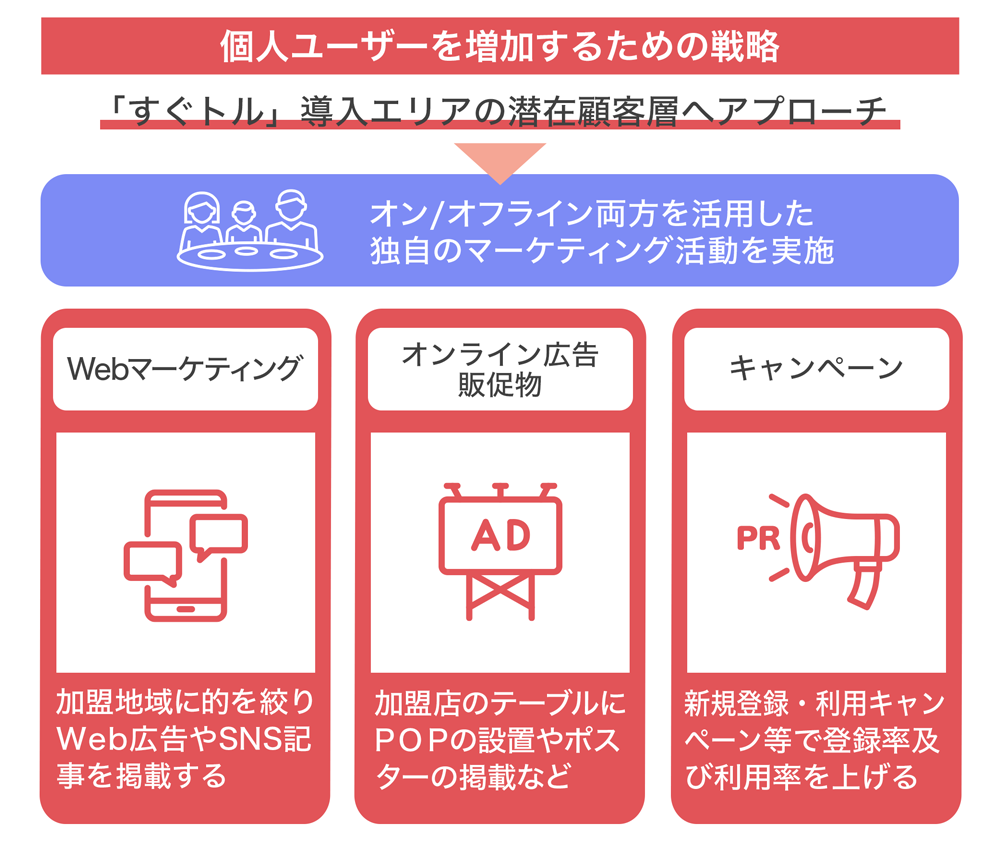 また、個人ユーザーの獲得には、地域特化型のWeb広告や、飲食店へのPOP設置、インフルエンサーマーケティング、その他にも独自の加入キャンペーン・イベントなどを実施して、サービスを展開しているエリアで活動する方々への利用を促しています。