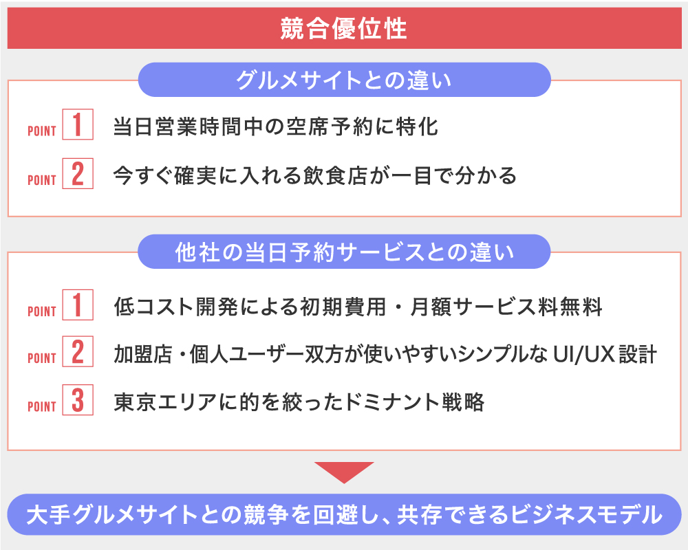 また、他の業界への派生も見込めます(カラオケ等のエンタメやスポーツ、ヘルスケア等)。実行性の観点からも、”現地にあるものをマッチングするプラットフォーム”は、ドミナント戦略で展開できるためベンチャー企業でも大手と戦うことができるのです。さらに、自身が想いを賭けられるだけの経験と思い入れが1stターゲットである「飲食業界」にあることも重要な要素でした。