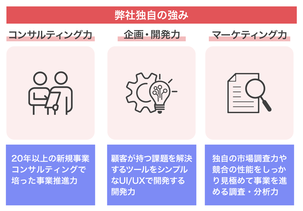 弊社の武器は、弊社代表の20年以上のコンサルティング経験から生まれる事業推進力だと自負しています。これまで、大手通信事業者からAIビジネスベンチャーなど30社以上の新規事業立ち上げを支援し、売上を増加するとともに、営業やサービス提供など経営の仕組み化を推進してきました。