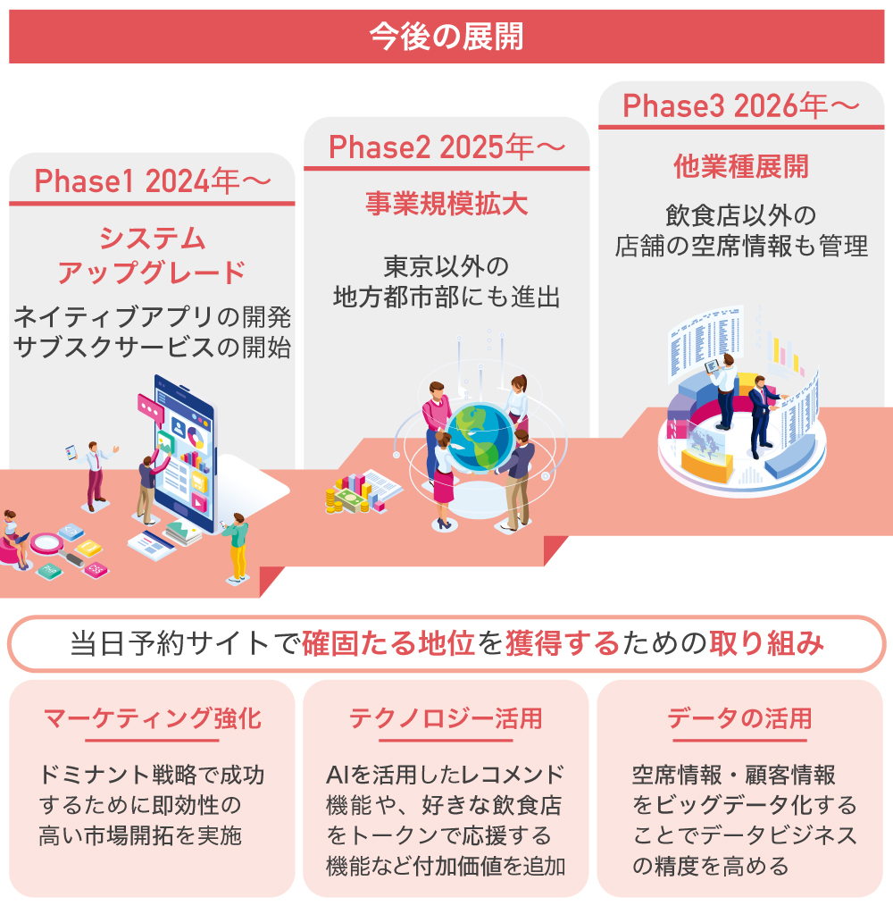 さらに2025年頃には、当日予約システムを飲食業以外の業界にも提供し、商業施設やカラオケ、スポーツ施設など様々な業界の店舗へと広げていく計画です。