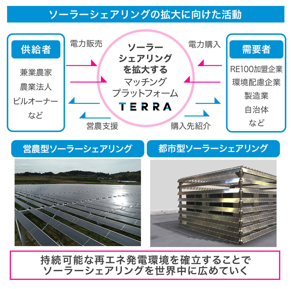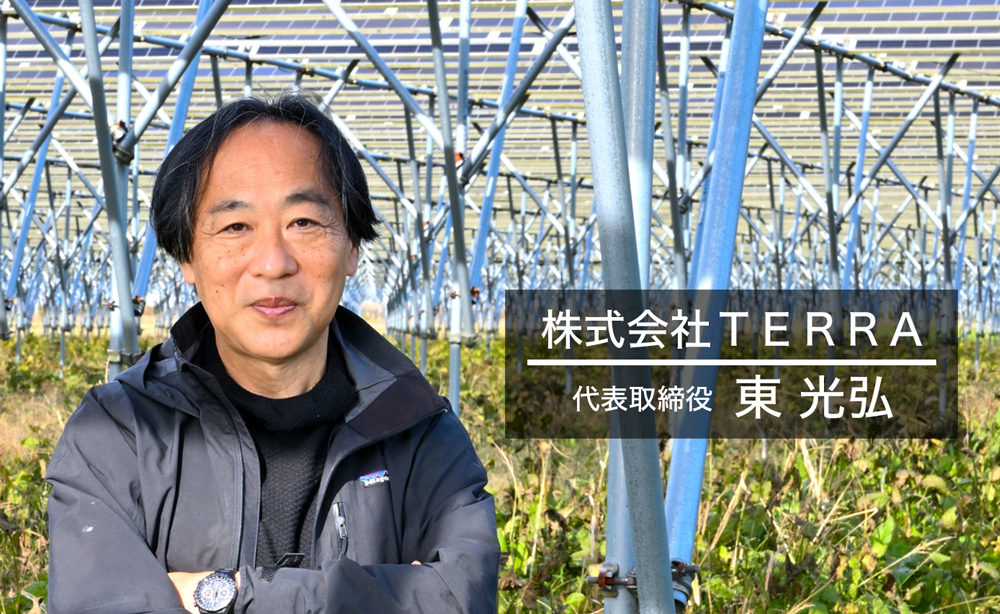 この株式会社TERRAは、千葉県匝瑳市で培ってきたこの営農型ソーラーシェアリングを核とする農業と地域の再生、地球環境の改善というベクトルをさらに進め、現状(今)を作り上げている古い考え方や常識を打破して、さらにミライに向けて一歩を踏み出したい、という思いから設立いたしました。