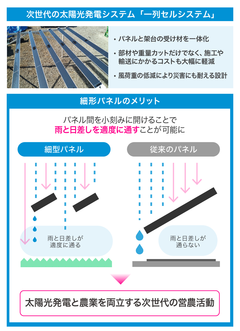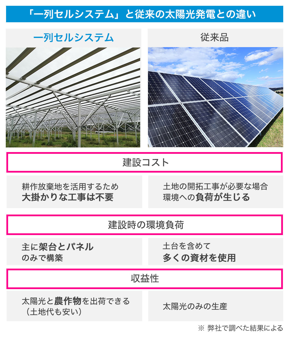 弊社は、土地ごとの自然環境を重視し、より環境負荷が少なく、低コストで導入できるソーラーシェアリングシステム「1列セルシステム」を日本の農村地域と都市部に提供していきます。
