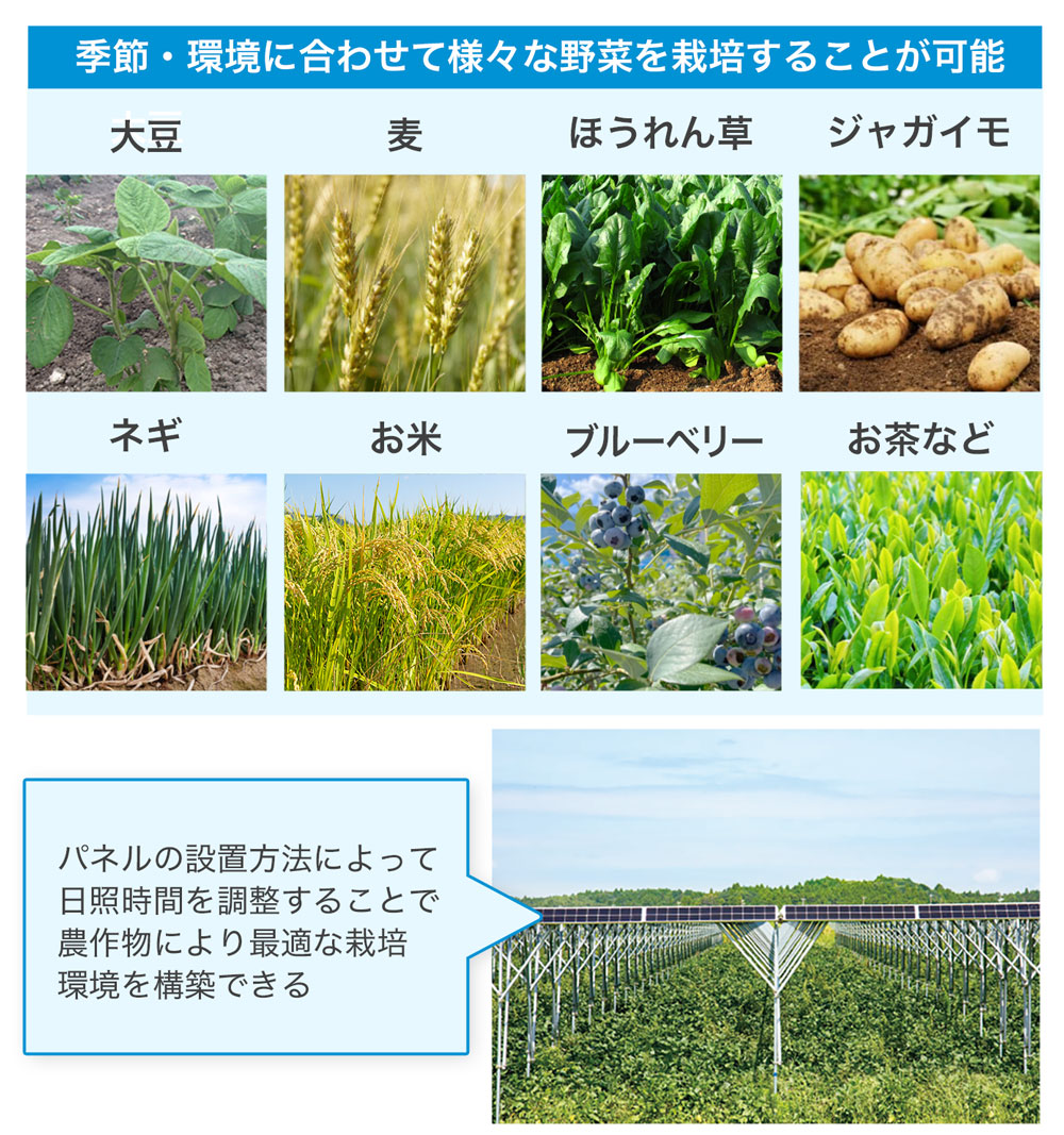 弊社の農村型太陽光発電設備は、農地の上に設置し、農作物を育てながらエネルギーを生み出すことが可能です。パネルとパネルの間に間隔があるため、農地の上にまたがるように設置しても太陽光を採り入れることができます。また、設置の仕方によっては、農作物により最適な環境をつくりながらエネルギーを生み出すことが可能です。