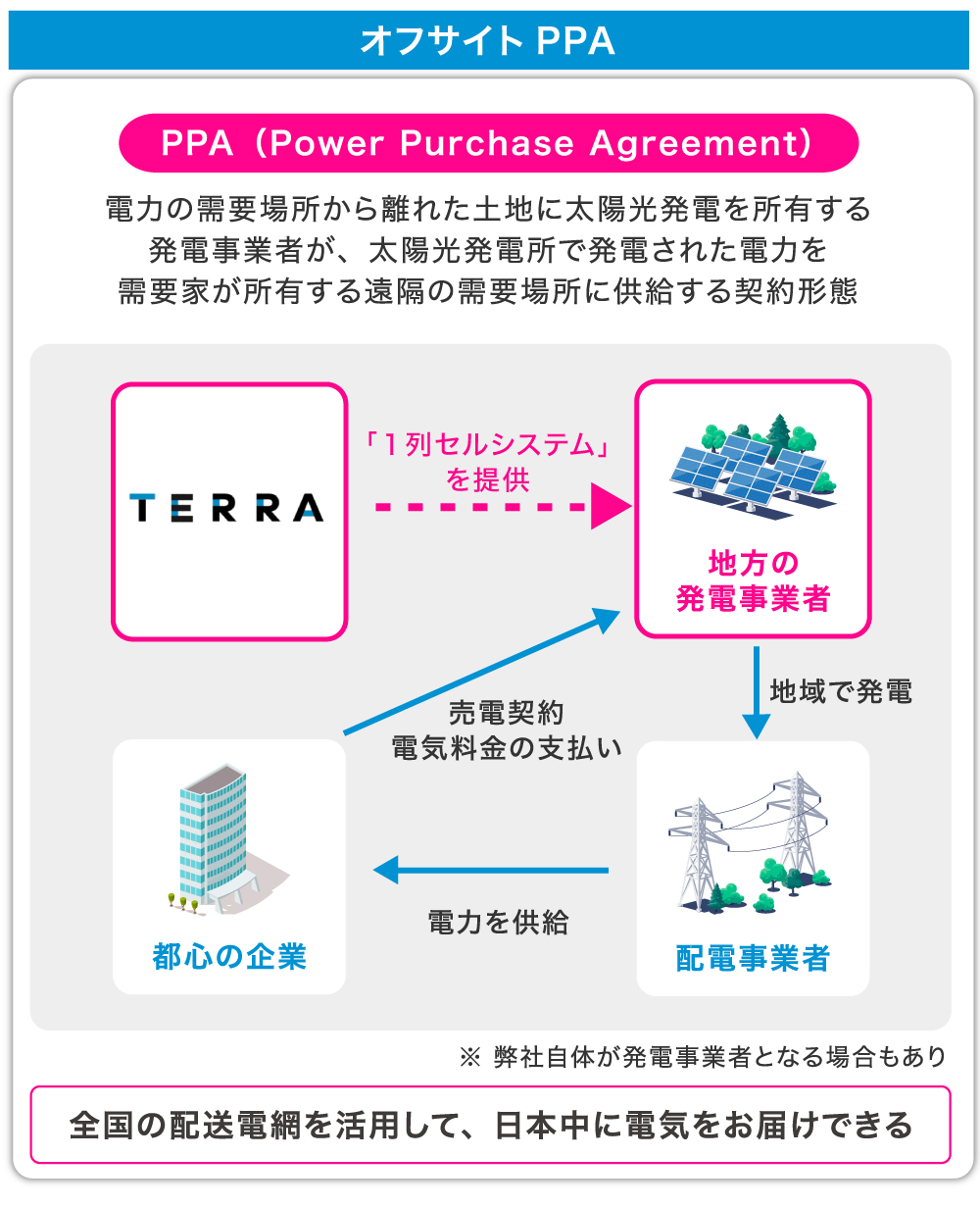 さらに弊社では、電力のオフサイトPPAにも対応しています。オフサイトPPAとは、遠隔地にある発電所から、電力を必要とする需要地まで電力を供給する契約のことです。つまり、農村地域で生産されたエネルギーを、都市部の企業などに提供することが可能になります。