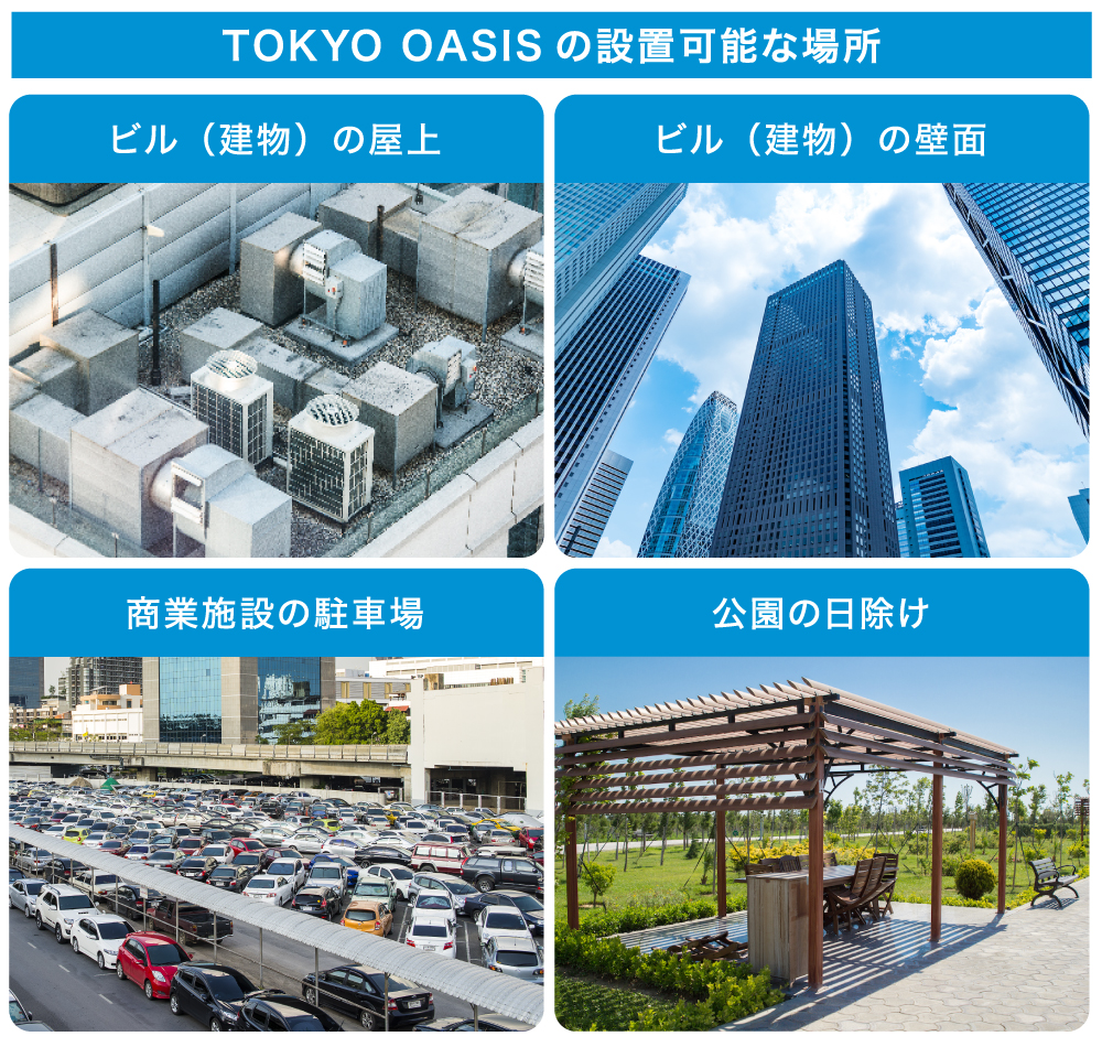都市部に対しては、都市型太陽光発電設備「TOKYO OASIS」を展開していきます。「1列セルシステム」はコンパクトなうえ立体的な設置が可能になるので、ビル屋上の配管や室外機などに影響されることが少ないため、従来では設置が困難だった古いビルの屋上でも設置できるようになります。さらには、室外機を囲うように設置すれば温度上昇を抑え、省エネにもつながると考えています。