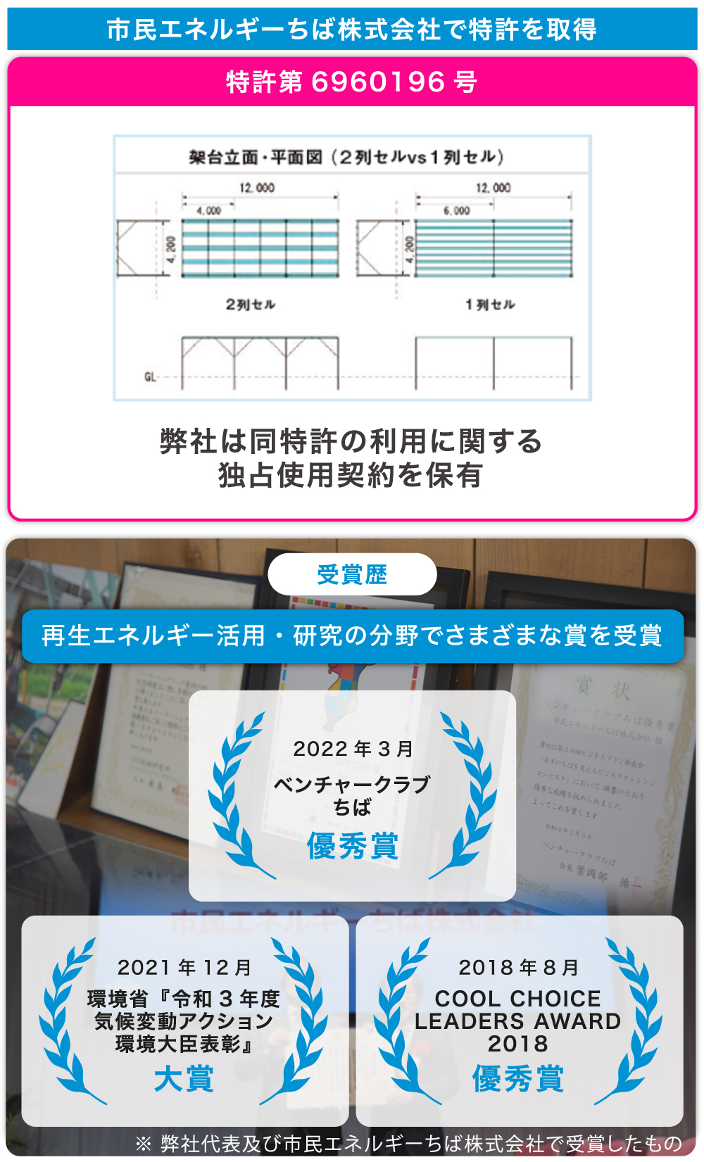 「一列セルシステム」のコア技術においては、開発元である市民エネルギーちば株式会社で特許を取得しており、弊社は特許の利用に関する特許独占使用契約を締結しています。