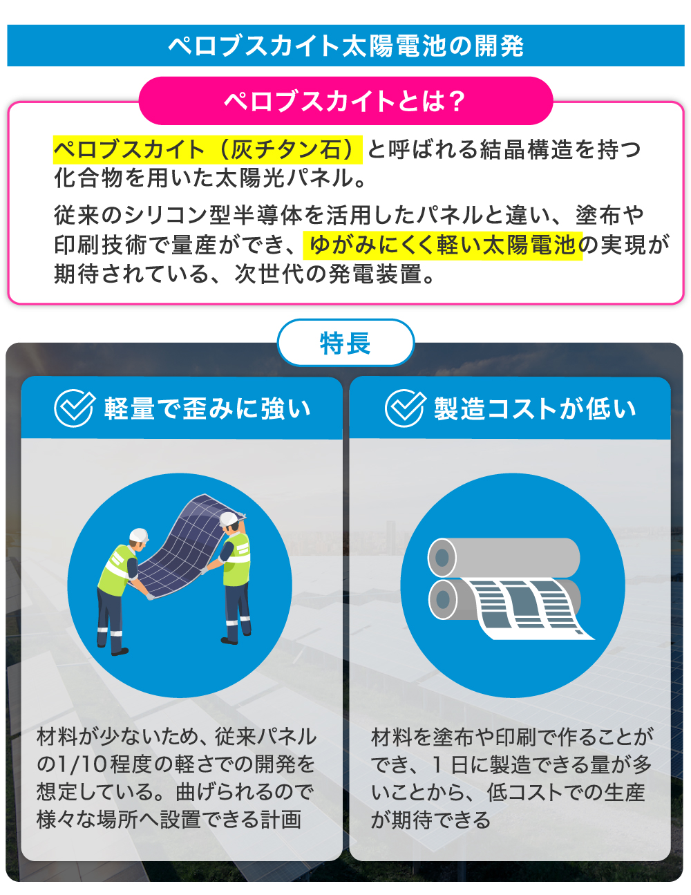 また、同社では次世代の太陽光発電技術であるペロブスカイト太陽電池の開発にも取り組んでいます。