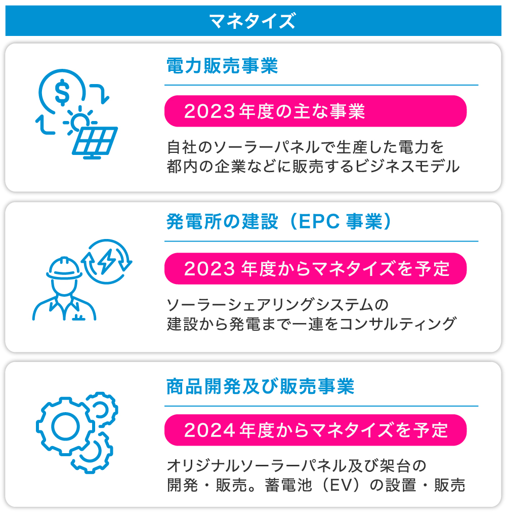 弊社は、自社発電による電力販売事業、発電所を建設するEPC事業、太陽光パネルの開発及び販売の3つでマネタイズを行なっています。