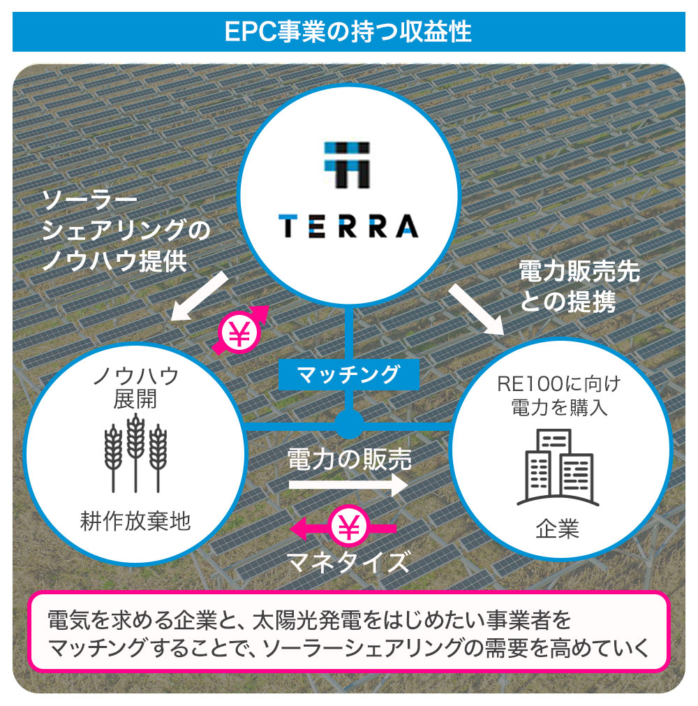 弊社で発電した電力は大手を含む国内の企業4社に販売しています。EPC事業については、地域の行政と連携しながら、各地の耕作放棄地に農地と発電所(オフサイトPPA)を合わせた次世代農業を構築していく計画です。