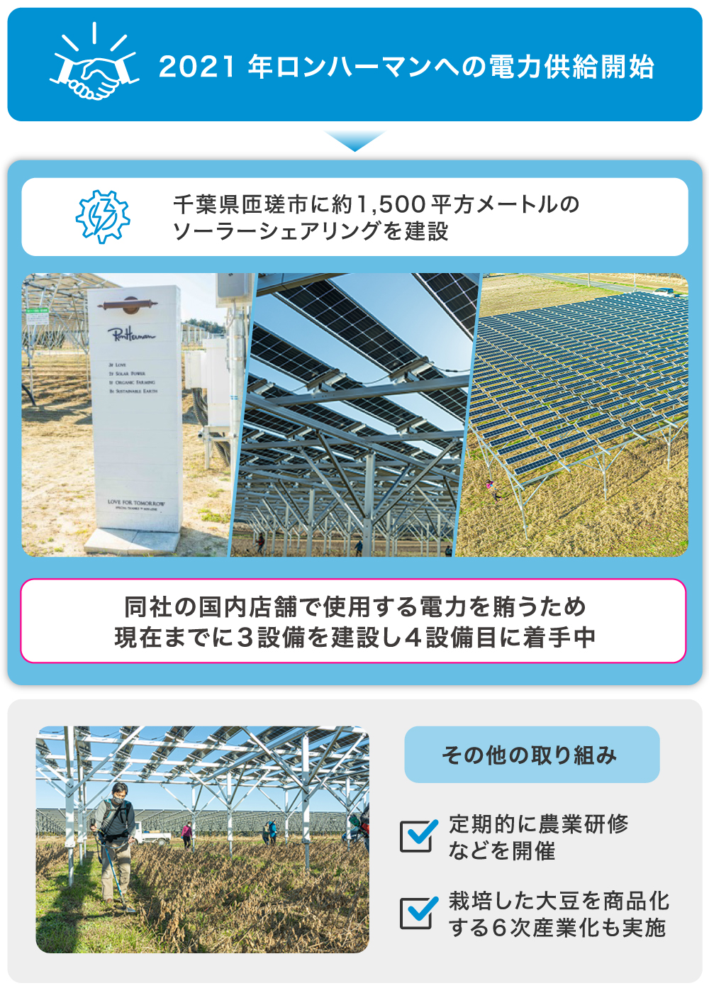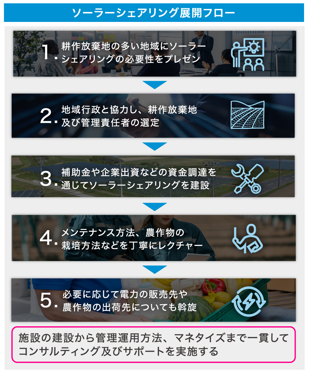 また、弊社は提携する企業への農業参入のサポートも対応が可能です。営農支援や行政との調整、社員への環境教育など、太陽光発電でエネルギーを生み出しながら農業を学ぶことで、企業に「RE100」を浸透させる一つの施策になると考えています。
