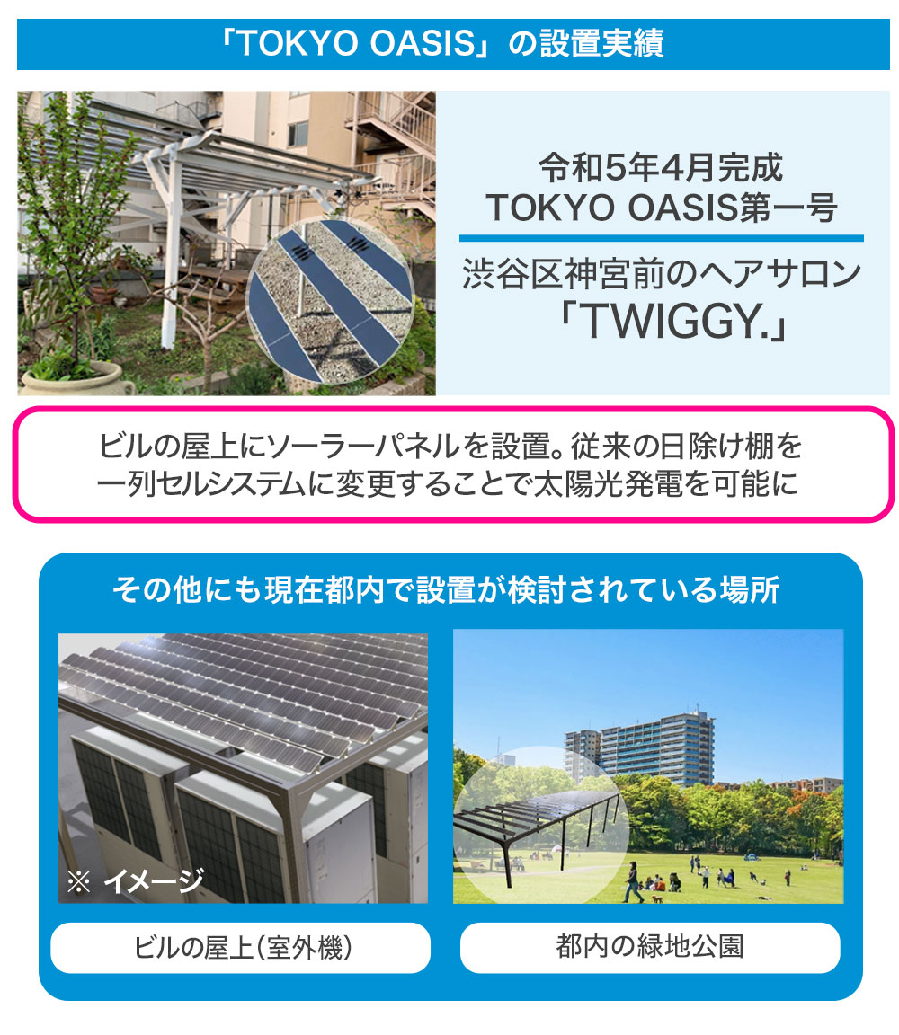 都市型太陽光発電「TOKYO OASIS」の具体的な成果物としては、東京都・渋谷区神宮前にあるヘアサロン兼カフェヘアサロン「TWIGGY.」のルーフトップ(屋上)に弊社の「一列セルシステム」を活用したパーゴラ(日除け棚)の第一号機が導入されています。