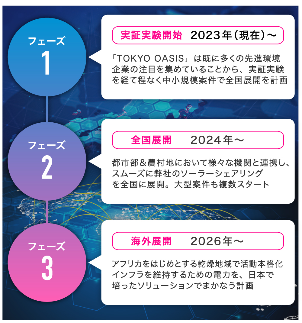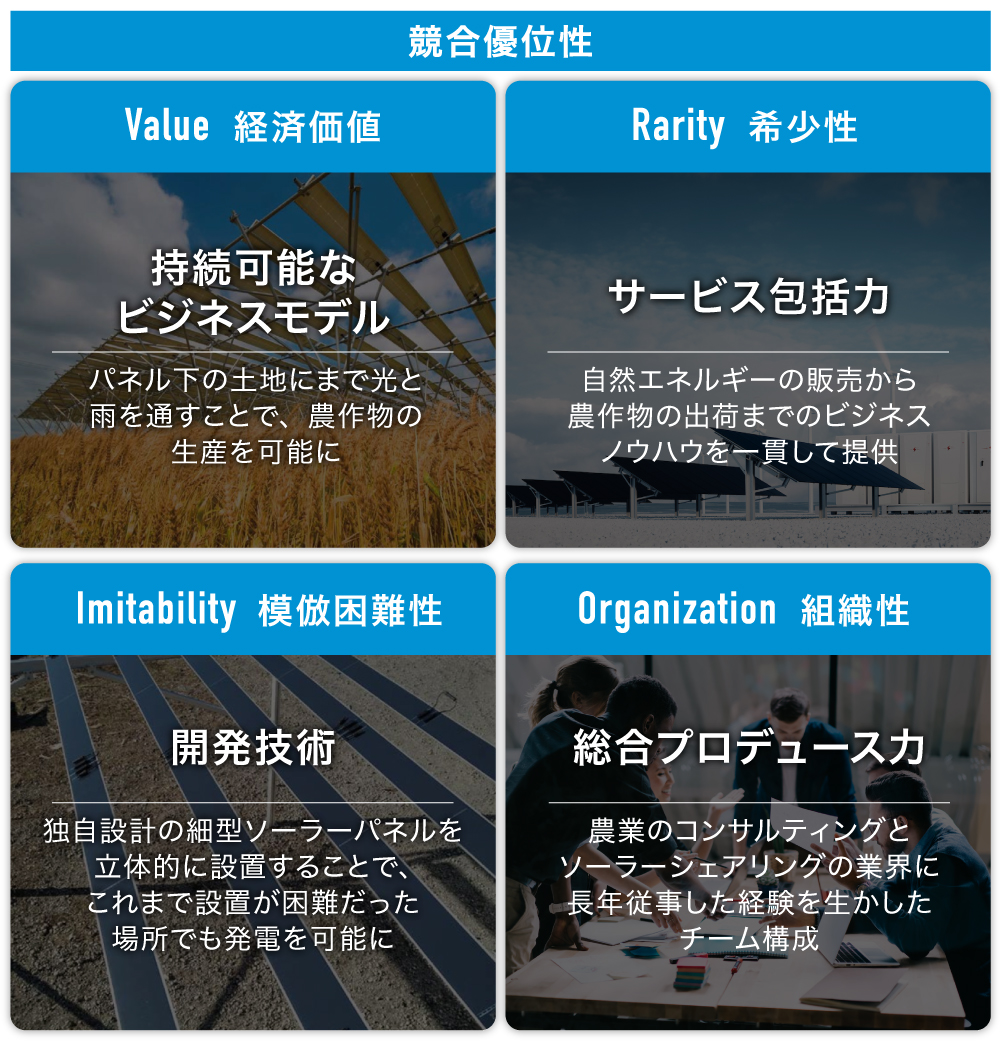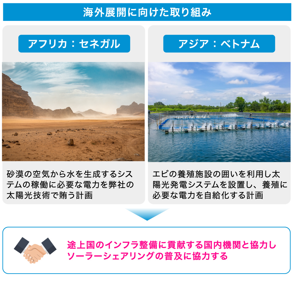 発電・流通・建設・保守や、農業を含めた用地活用まで総合的にプロデュースでき、エネルギー事業に関して地域おこしも含めて、包括的な提案が可能な点が弊社の強みです。同技術を国内に展開していくと同時に、ベトナムやアフリカへの海外展開も計画しており、砂漠化やエネルギー問題などを抱える発展途上国の課題解決にも積極的に取り組んでいきます。
