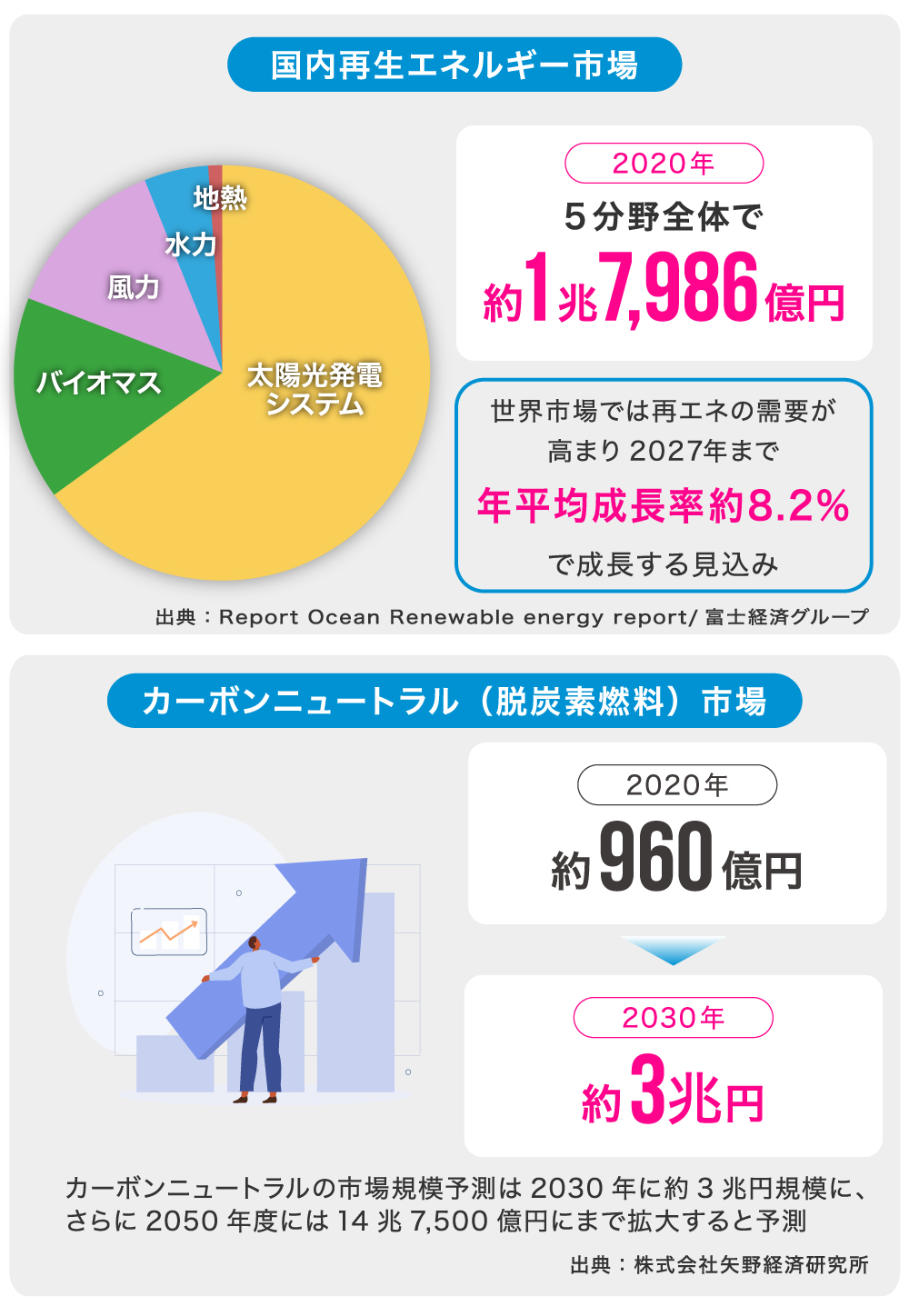 昨今の企業の環境意識が高まったことも相まって、自然エネルギーの需要が高まり、世界全体の市場規模は、2021年から2027年までの予測期間中、年平均成長率8.2%で成長すると見込まれています(出典:Report Ocean)。