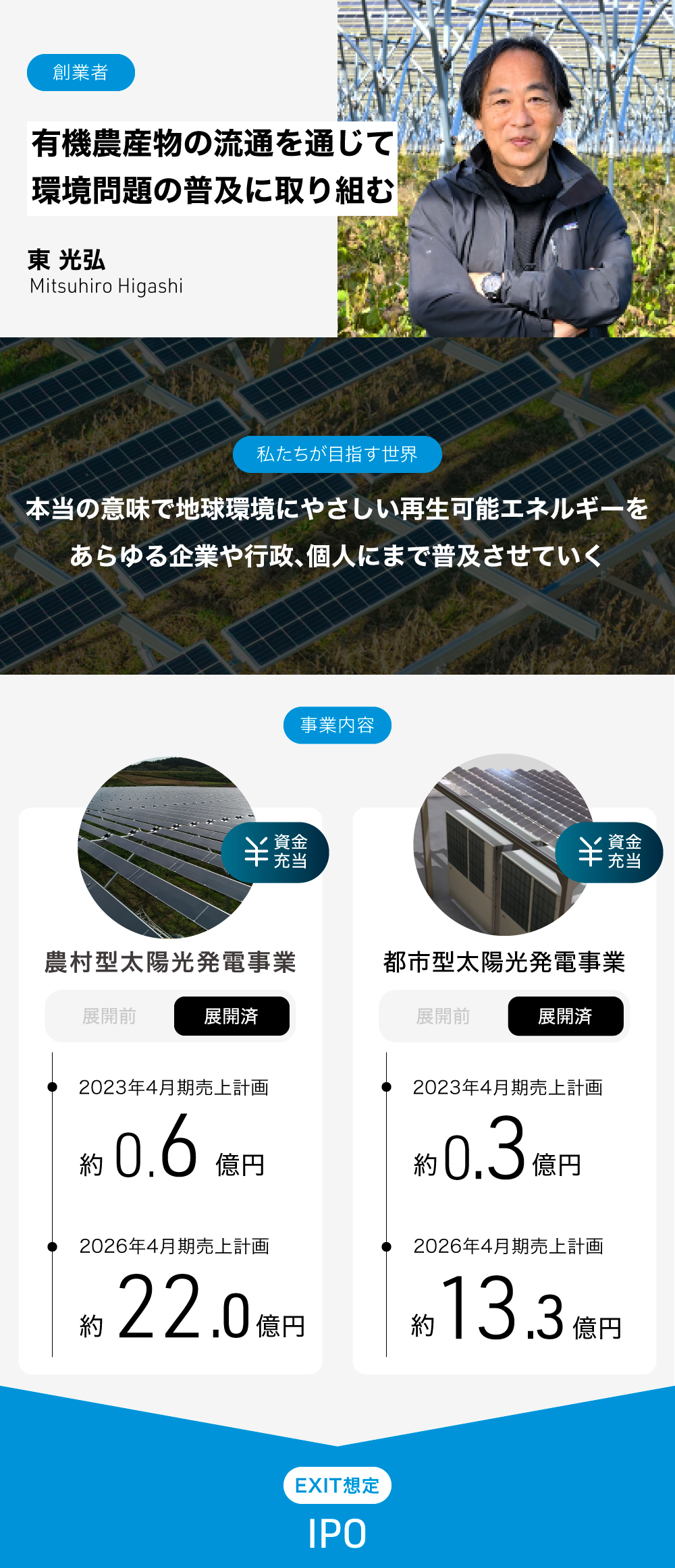 千葉県匝瑳市での成功を踏まえ、私たちはこの仕組みを日本全国、そして現地ニーズに応じる形で海外にも広げることを目指しています。有機栽培・不耕起栽培をベースとした営農型ソーラーシェアリングを広げていくことで、地球の脱炭素化を加速させることに貢献できると信じています。投資家の皆様におかれましても、脱炭素化した未来を早期に実現するために、力をお貸しいただけたら嬉しいです。よろしくお願い申し上げます。