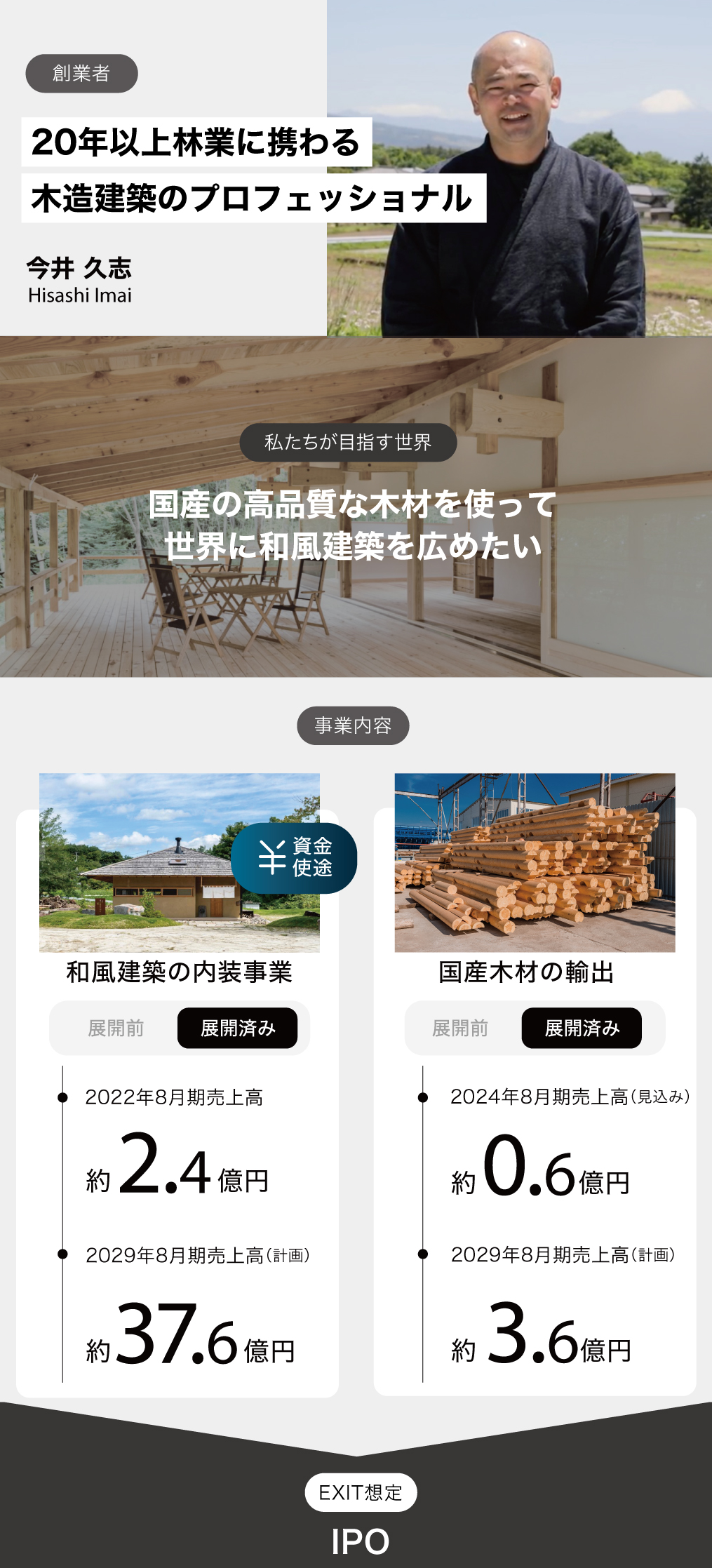 代表の今井は、林業での経験を経て建築業界に参入し、日本の木材・建築業界に精通しています。