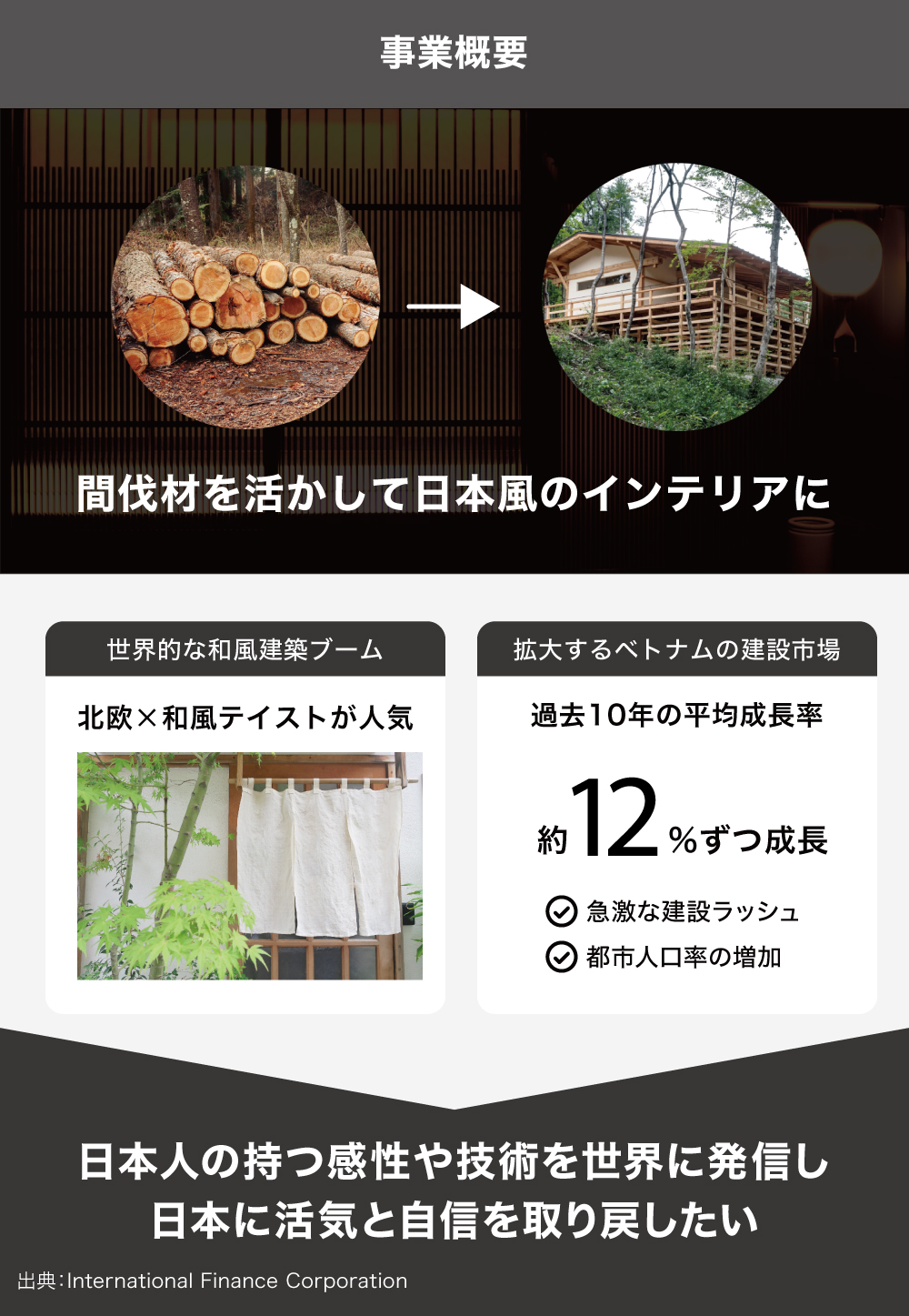 そのような林業の現状に課題を感じた今井は、捨てられるだけの木材の価値を活かす方法を模索し、日本の伝統工法や和風建築を世界に展開するビジネスを創業しました。