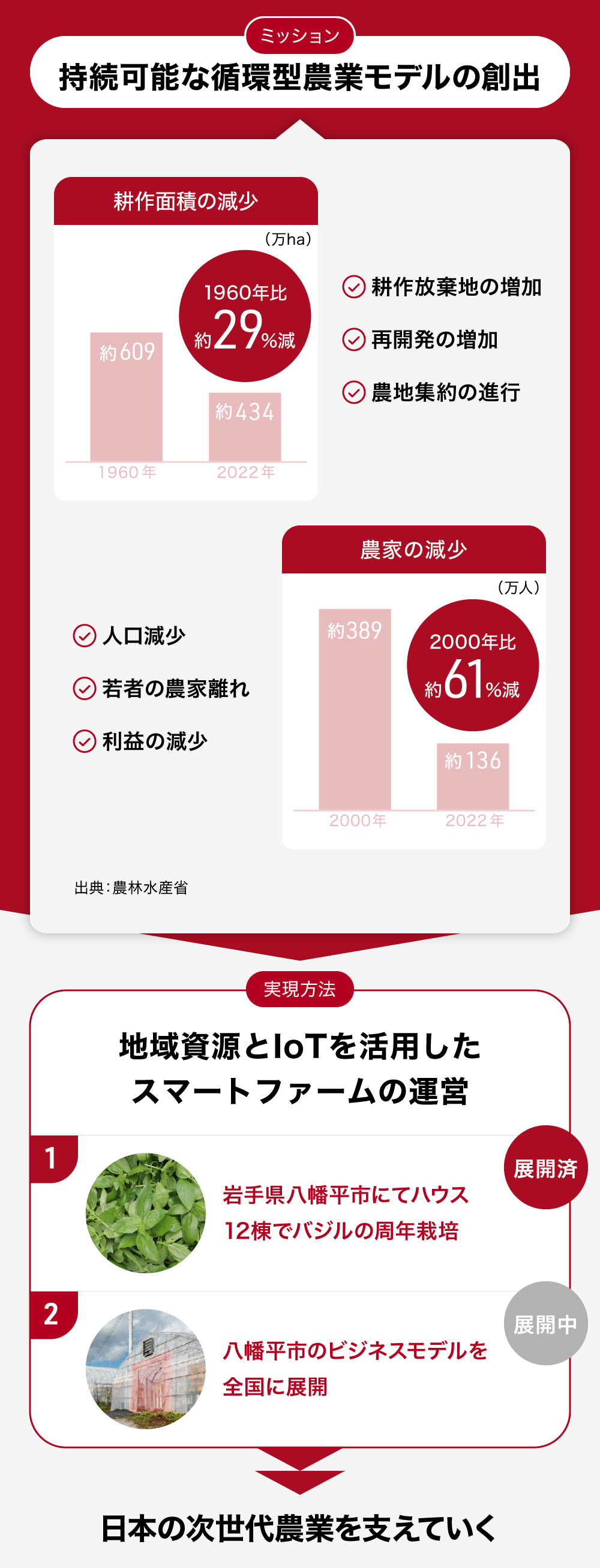 「地域社会の雇用を創出して、より豊かな社会を創造する」ビジョンに向けて、IoT技術と地域資源活用のスマートファーム事業を推進
