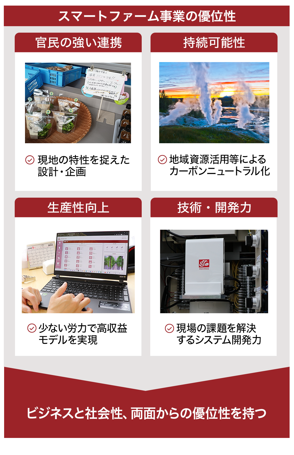 このように、各地域にはさまざまな資源が存在しています。こうした地域特有の強みを活かした生産モデル(スマートファーム)をその地域にあわせて設計することで、新たな特産品と収益源を生み出すことができていると考えています。
