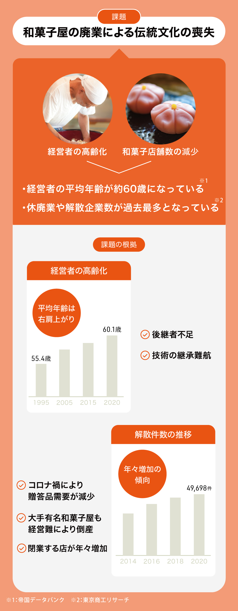 しかし、和菓子屋の経営者年齢は高齢化しており、経営者の平均年齢は約60歳となっています(出典:帝国データバンク)。また、倒産件数は減少しているものの、休廃業や解散企業数は過去最多となっています(出典:東京商工リサーチ)。