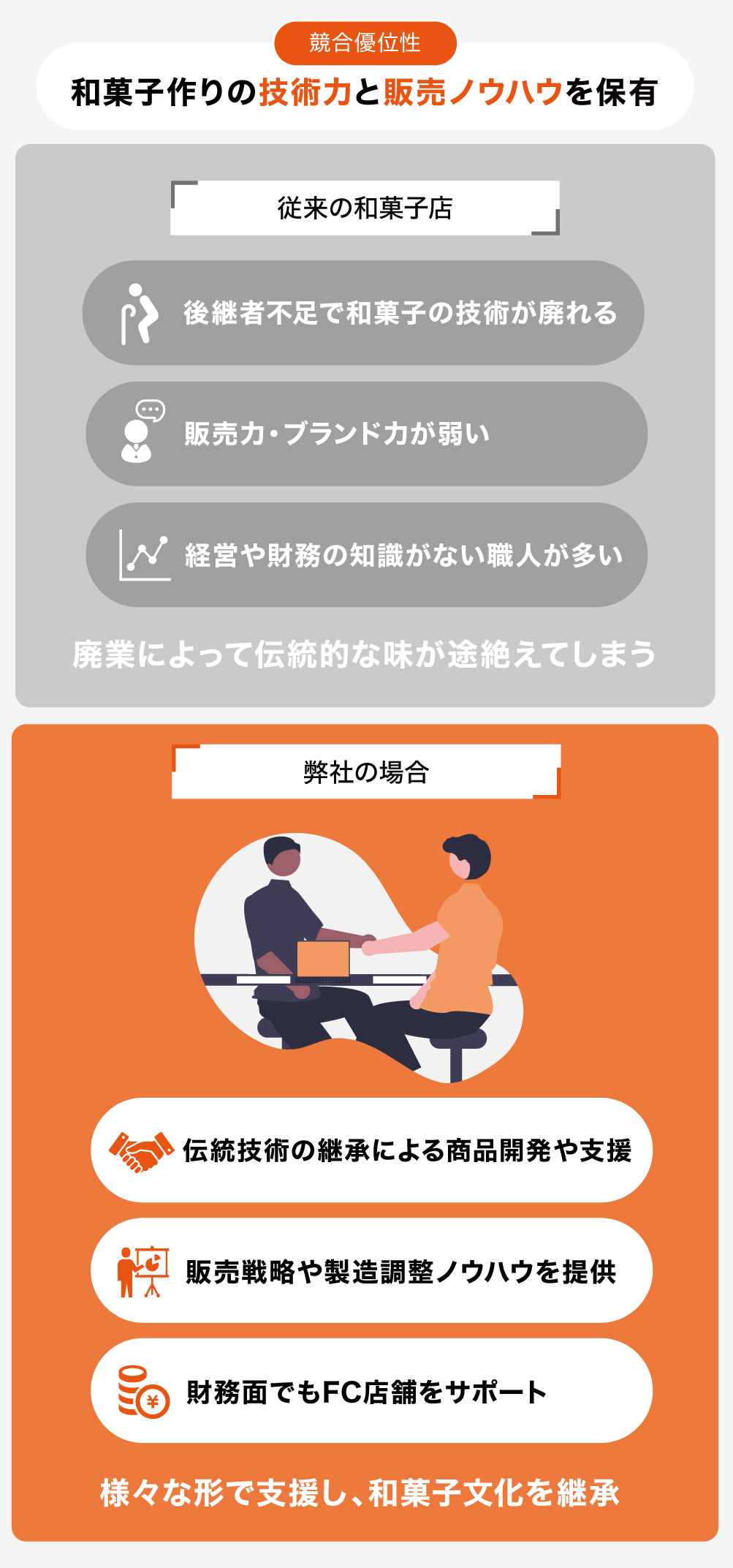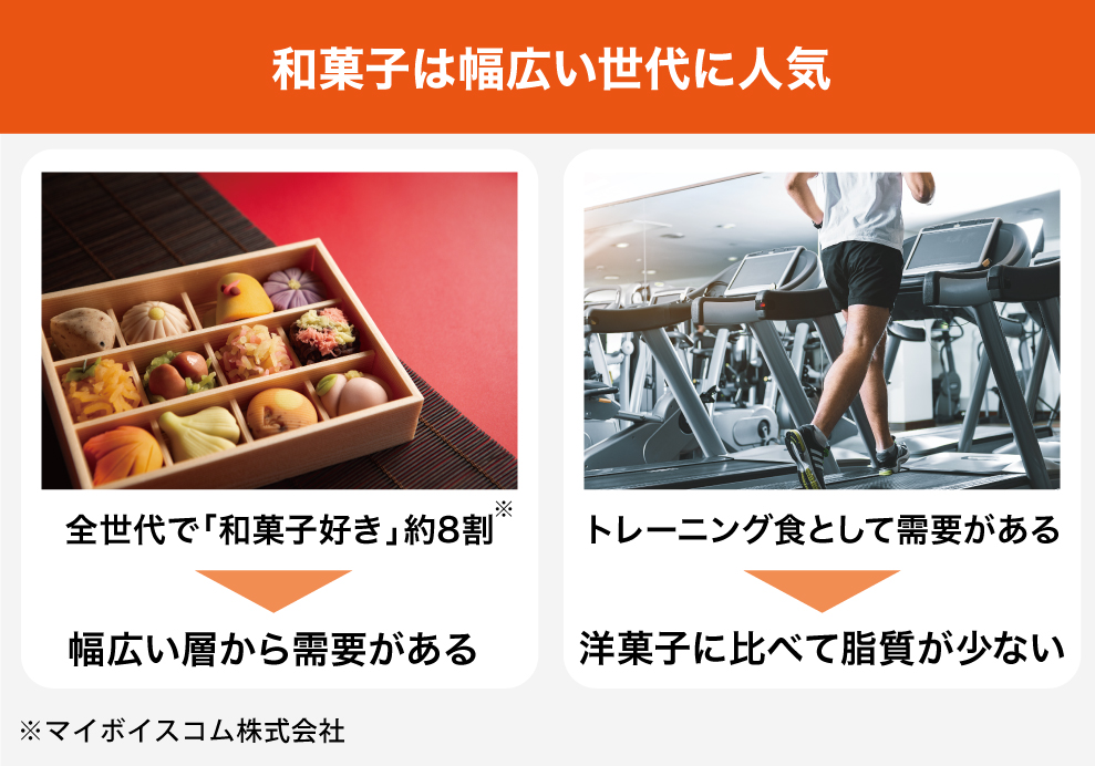 現在、事業再構築の流れや和菓子需要の高まりにより、他業種からの新規参入が増えています(自社調査より)。弊社はそうした企業に対し、これらの優位性をもって商品開発や販売ノウハウを提供します。