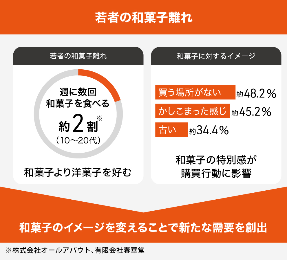 和菓子は職人技術であり、どうしてもレシピやノウハウが職人の中でブラックボックス化してしまう問題があります。そうした技術は一子相伝で継承することが前提であるものの、少子高齢化による後継者不足で跡継ぎがおらず、廃業する和菓子屋が増えているのです。