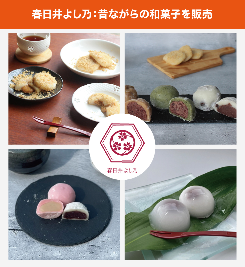 「春日井よし乃」は、大福をメインにお餅や団子、羊羹などの昔ながらの伝統的な和菓子を展開しています。現在、愛知県内の常設店舗の他、東海から関東を中心に大手百貨店や商業施設などでのイベント・催事で出張販売しています。