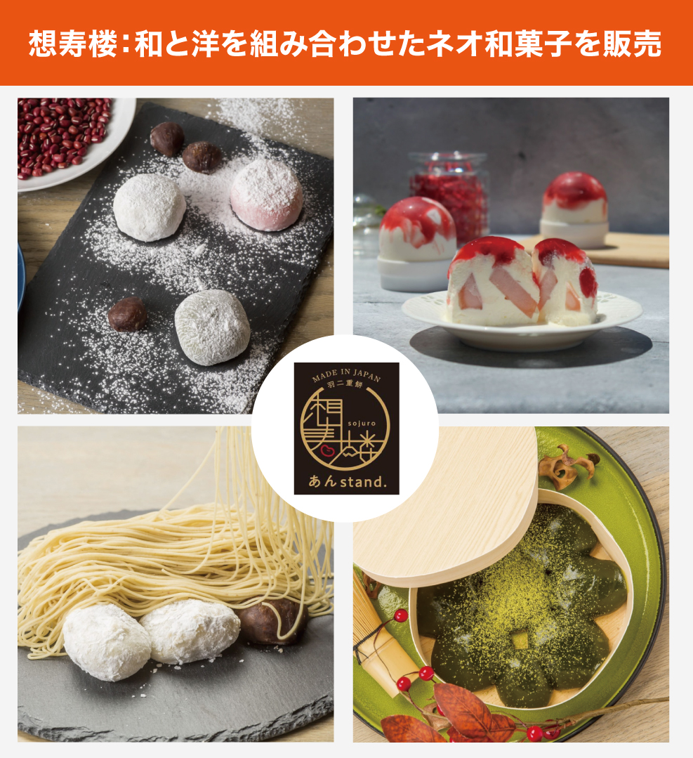 一方「想寿楼」は、現役パティシエの監修で立ち上げた新ブランドで、和菓子に洋菓子の要素を取り入れた、いわゆる「ネオ和菓子」のオリジナル商品を販売しています。SNS映えする見た目やパッケージにもこだわり、今までにない革新的な和菓子を提案しています。