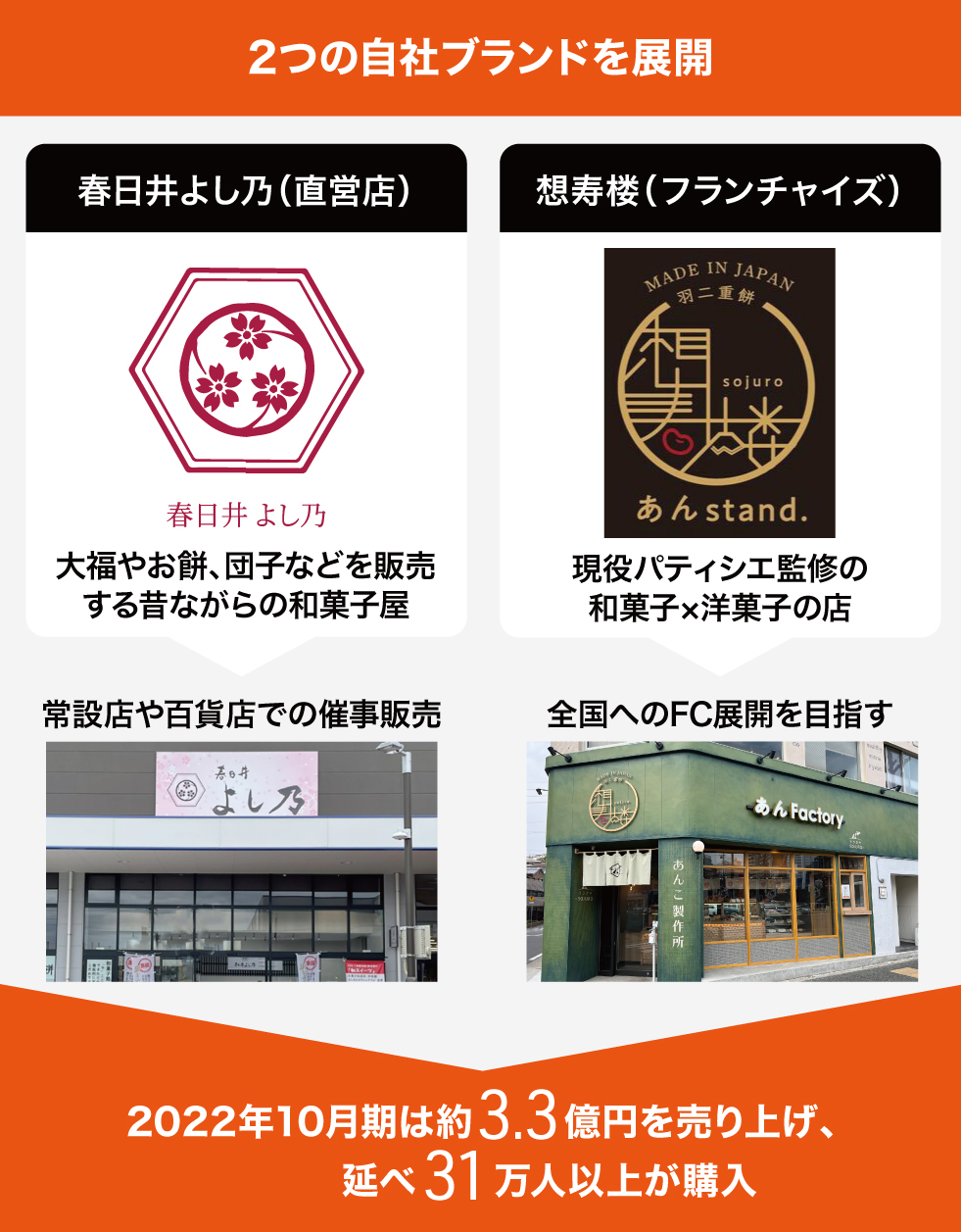 弊社は、老舗和菓子屋の技術を受け継いだ和菓子ブランド「春日井よし乃」と、洋菓子の要素を取り入れた新しい和菓子を提案する「想寿楼(そうじゅろう)」の2つのブランドを展開しています。