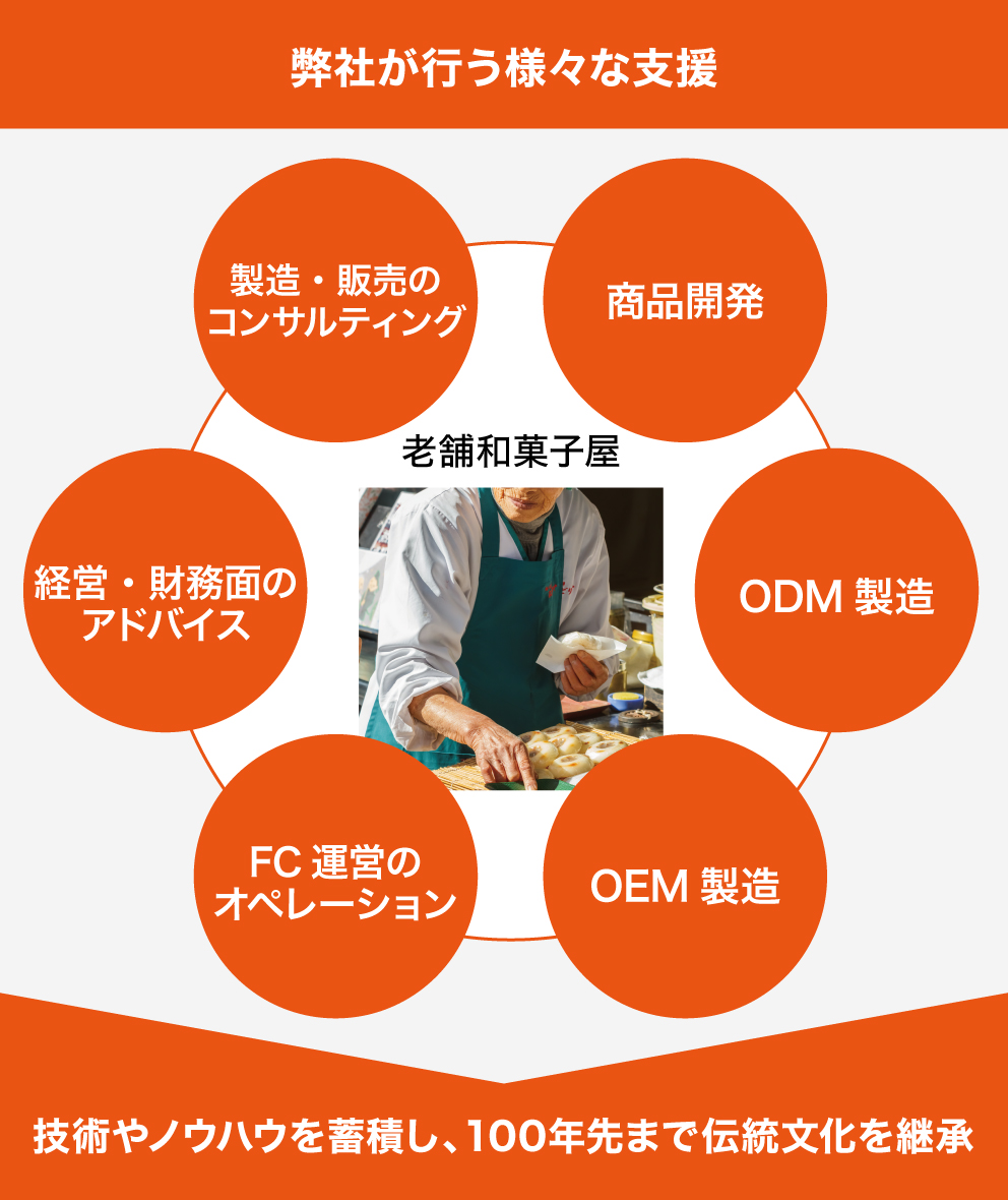 後継者不足による廃業の危機にある和菓子屋は、日本全国に数多くあります。そこで弊社は、優れた和菓子作りの技術を持っているにも関わらず、廃業の危機に直面している企業に対し、様々な形で支援を行っていきたいと考えています。
