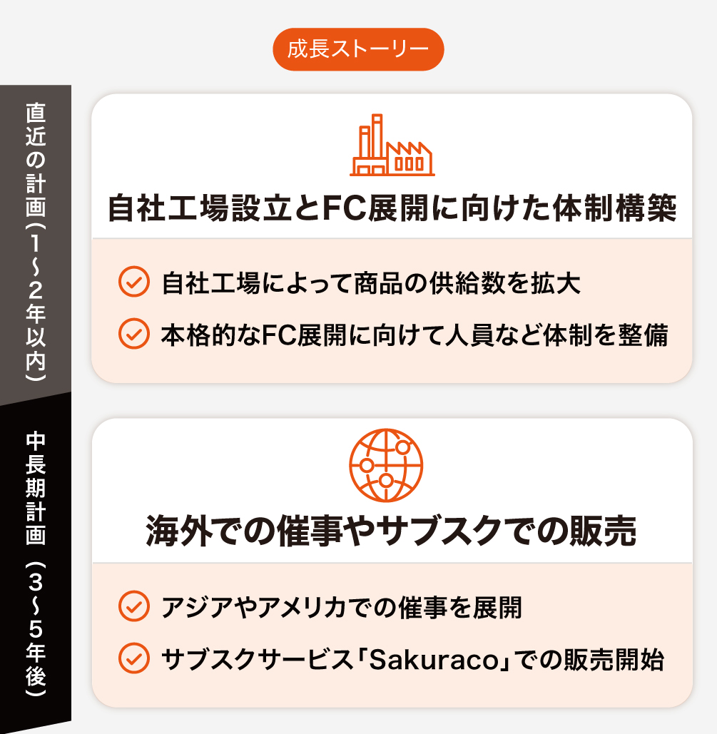 今回の資金調達によって自社工場を設立して生産力を拡大することで、まずは日本での生産・販売を広めていく計画です。将来的には日本の和菓子を世界に届けたいと考えており、今回はそのための第一歩であると考えています。