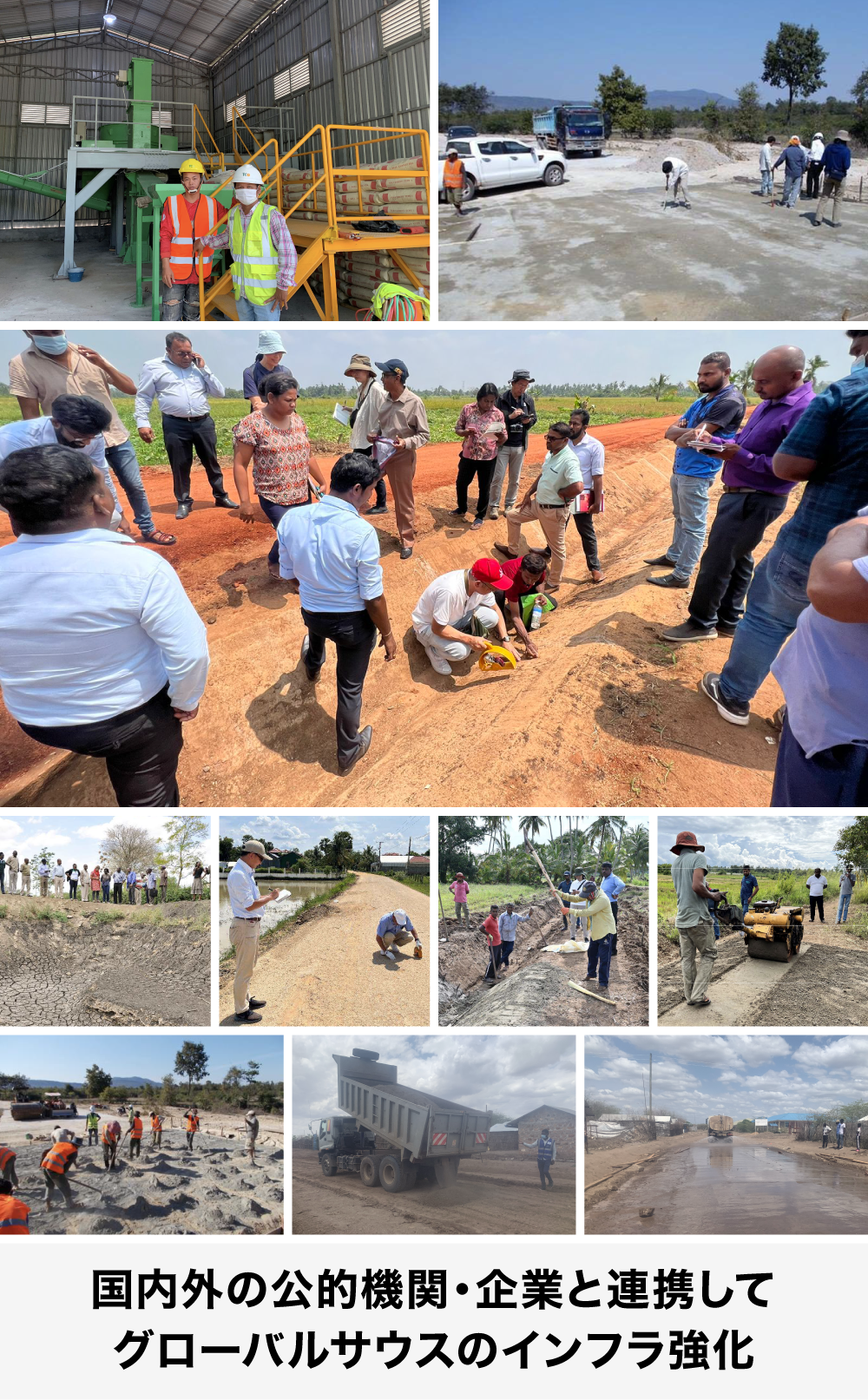 このままでは、農業をはじめとした生産活動や資源、人の輸送などを妨げ、経済の発展を遅らせるだけでなく、劣悪な生活環境による健康被害の深刻さは増すばかりです。これからの世界経済の成長を担う発展途上国において、インフラの整備は急務であり、現地ニーズと環境に配慮した材料や工法が必要であると考えています。