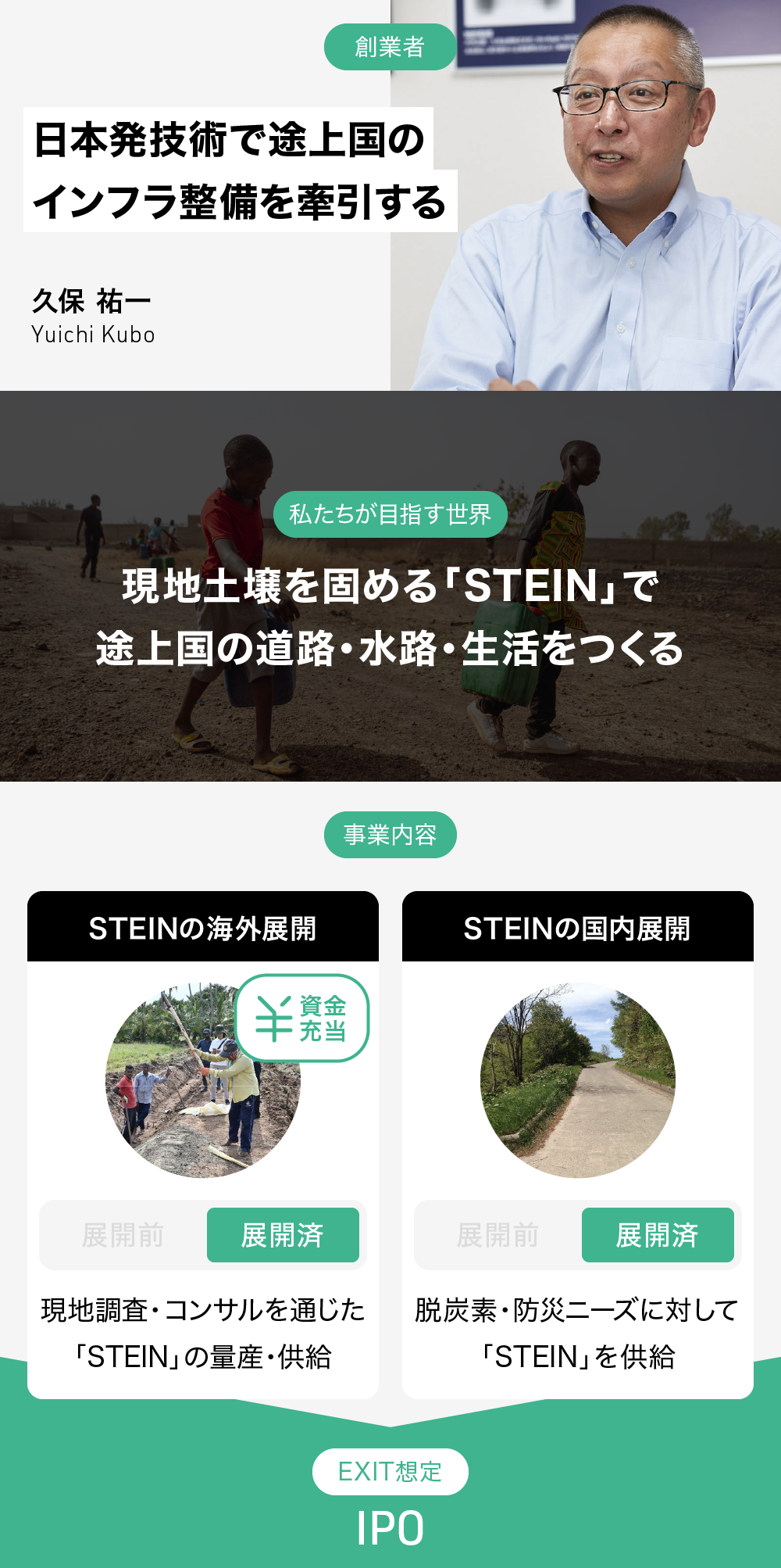 途上国の多くは、インフラ整備への予算が限られており、「STEIN」のような低コストかつ耐久性に優れた素材を求めていると考えています。さらに、脱炭素要素も公的機関の協力を得る上で欠かせません。