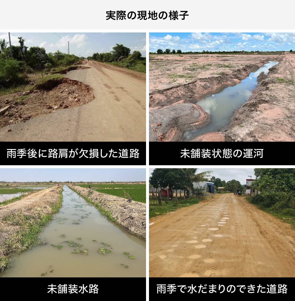 弊社はJICAの民間連携事業(案件化調査及び普及・実証事業)に採択されたことで、「STEIN」を用いたカンボジアでの灌漑設備や道路の施工を行いました。同国では、農業がGDPの約24.3%(出典:外務省)を占める主要産業となっている中、水災害が多く、雨季には道路などの破損・決壊が起こり、乾季には農業用水の確保が難しく、住民は不便な生活を余儀なくされていました。
