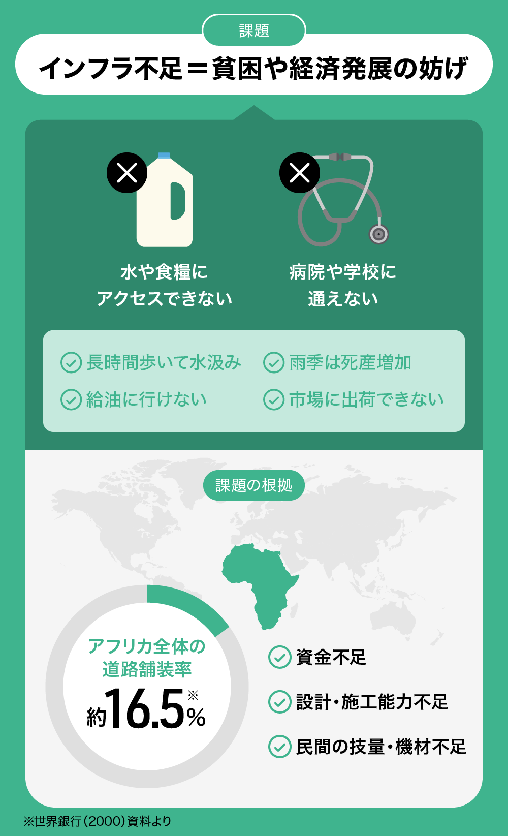 2000年のデータにはなりますが、アフリカ全体では、道路の舗装率はわずか約16.5%でしかありませんでした(出典:世界銀行2000)。近年になって弊社が現地訪問する中でも、こうしたインフラ整備の状況は中々改善していないように思われます。道路や水路が舗装されていないと、雨季には道がぬかるみ、車やバイクは通れず、食糧が届かない、学校や病院へのアクセスが絶たれる、豪雨で洪水や周辺の農地への被害が出るなど、多くの悪影響が発生します。さらに、乾季には水源が枯渇するなど、1年を通して不便を強いられている現状があります。