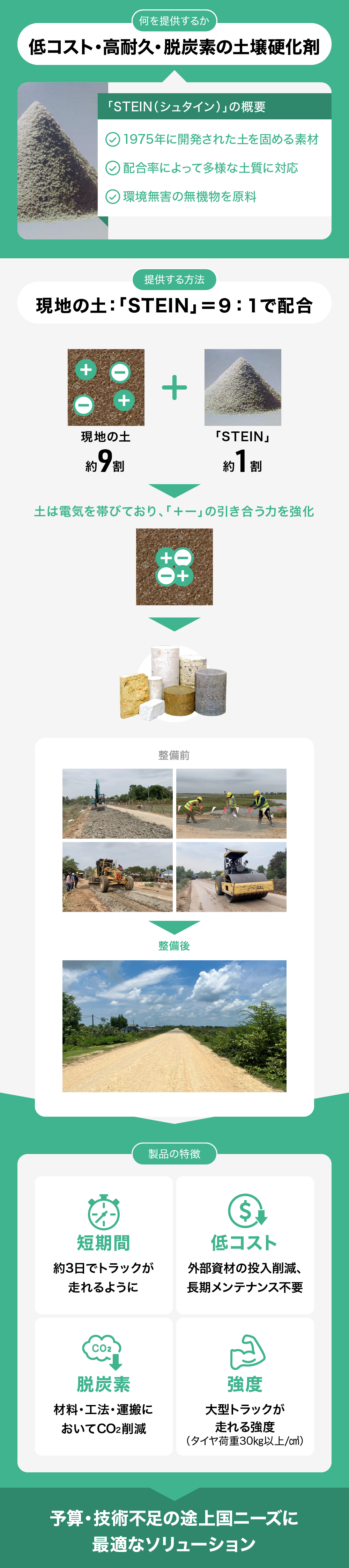 弊社は、土壌を短期間に固める特殊な土壌硬化剤「STEIN」を用いて、発展途上国の道路や水路などのインフラ整備を進めていきたいと考えています。