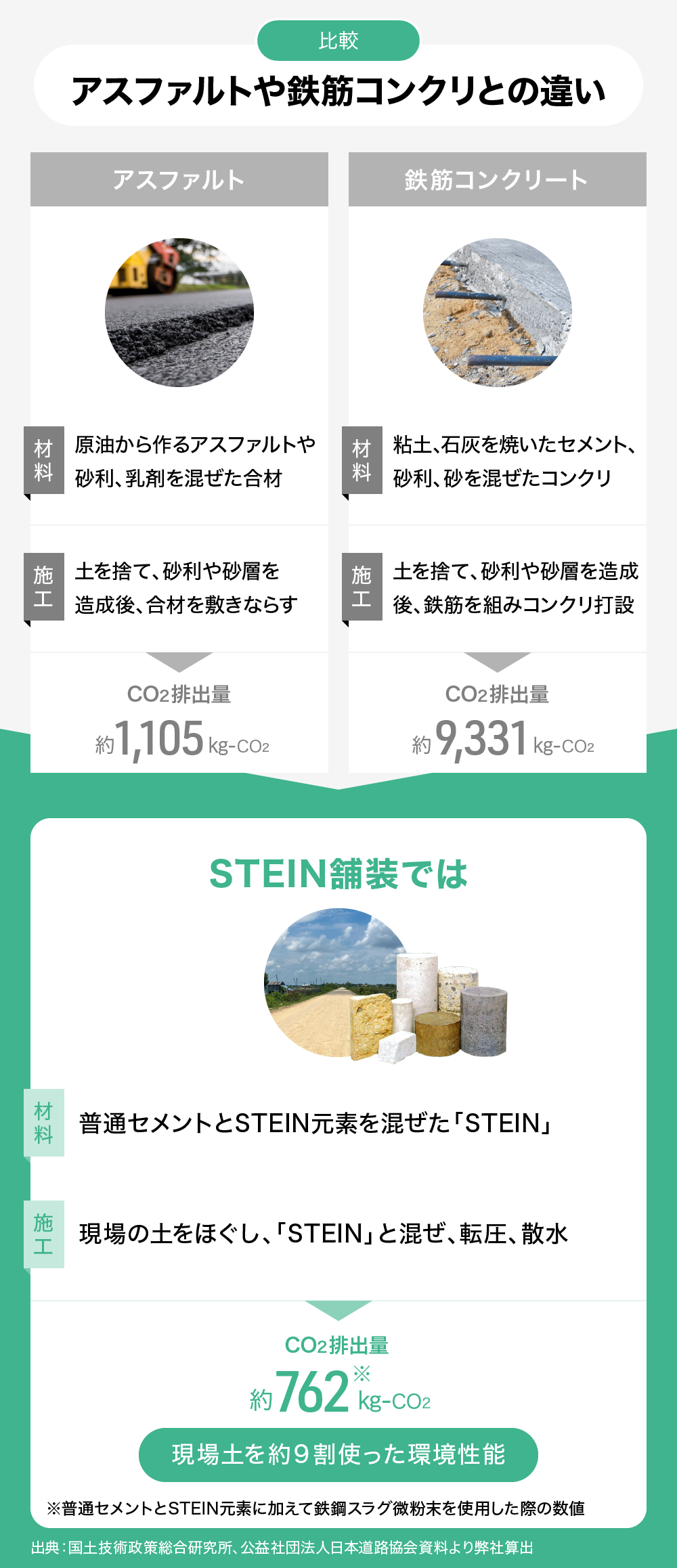 「STEIN」を使った舗装との比較として挙げられるのが、アスファルト舗装や鉄筋コンクリート舗装ですが、これらは原材料や施工過程で多くのコストや技術力を要します。また、排出するCO2量もボトルネックとなっていました。対する「STEIN」を使った舗装は、環境負荷が低い原材料を使用するだけでなく、現地の土を使った施工や運送面でも環境にやさしい工法であると言えると思います。