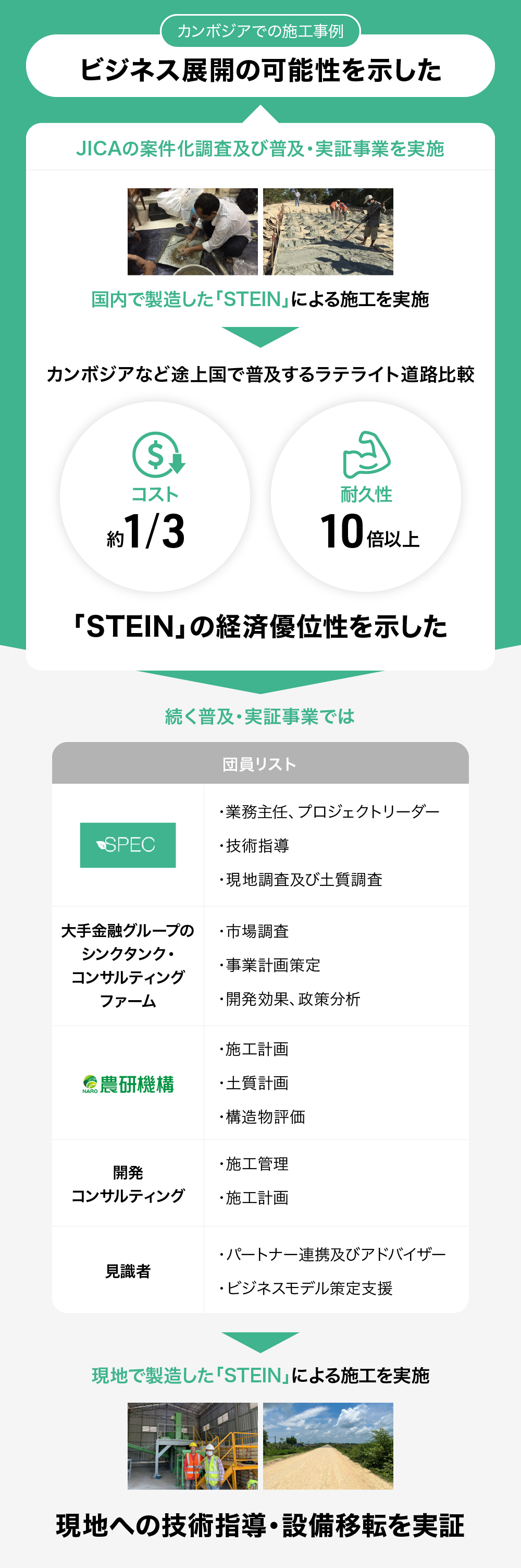 「STEIN」は、2015年東京都中小企業振興公社の海外販路開拓支援事業の支援対象商品に採択(2015)されており、道路や水路の整備に活用することで、途上国のインフラ発展に貢献しています。カンボジアでの事例においては、途上国で普及するラテライト道路と比較してコスト約3分の1、耐久性10倍以上という成果を得るなど、資金や技術が不足する発展途上国のニーズに合っていると考えています。