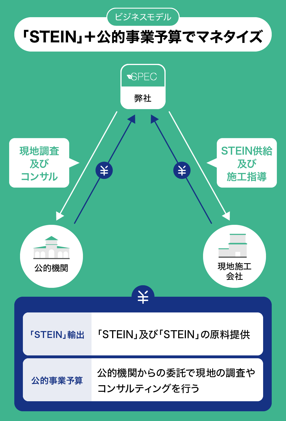 弊社が手掛ける案件の多くは、公的機関やその代理店からの依頼を受けスタートします。現地の土壌・土質の調査やコンサルティングなどスーパーバイザー的な役割を担い、施工に必要な「STEIN」を海外に供給することで収益を確保しています。