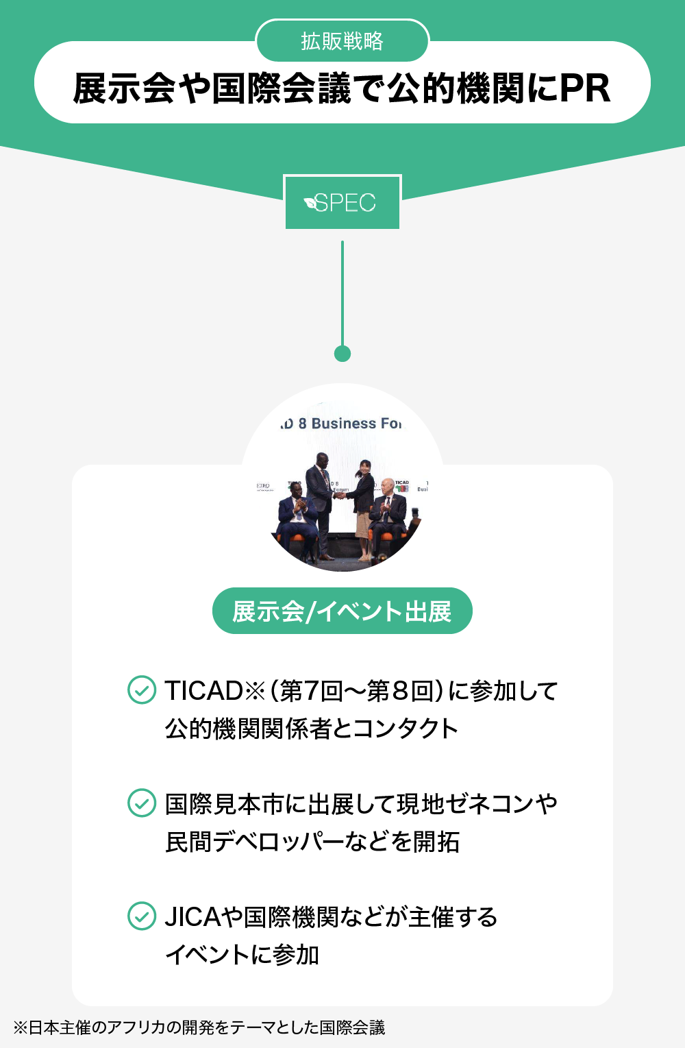 弊社は、公的機関との連携を通じて、「STEIN」の拡販を目指していきます。そのため、国内外のイベントや展示会出展などを通じて公的機関関係者に「STEIN」を知っていただくPR活動を強化していきます。これまでにも日本政府主導のアフリカ開発会議(TICAD)への出展をきっかけにアフリカのパートナーを開拓するなどの成果を得ています。