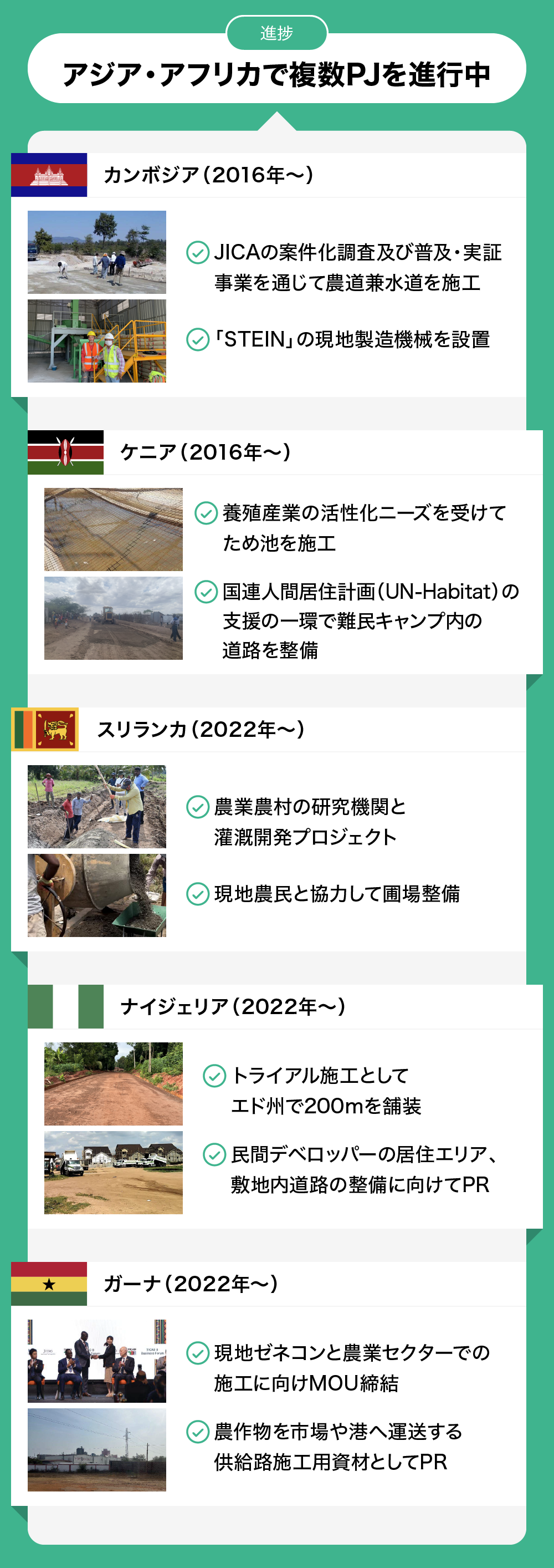 こうしたPRなどを通じて、ケニアの養殖池や難民キャンプ地整備、ガーナのカカオロード整備など各地域のニーズに応えています。直近では、人口増が加速するナイジェリアの道路整備のほか、経済産業省のJ-Partnershipに採択されたことで、ケニアのMOI大学と共同研究を進め、土木工事の際に問題となるブラックコットンソイルの硬化、道路やため池の施工を予定しています。